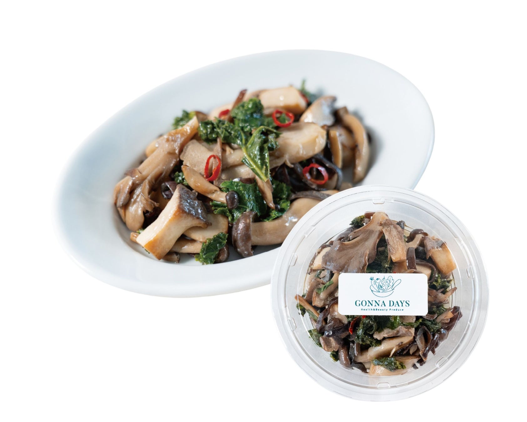 4種のきのこ(エリンギ・しめじ・舞茸・きくらげ)を香ばしくソテーし、アンチョビの旨みを加えたビネガーマリネ。ほろ苦いケールをアクセントに加えることで、香りとコク、彩りがバランスよく調和した一皿に仕上げました。白ワインとの相性も良い、大人な味わいの人気デリカテッセンです。