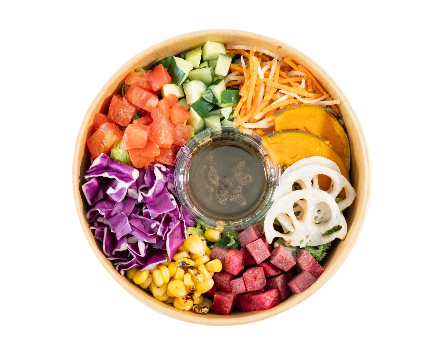 大きなメカジキと彩り豊かなグリル野菜、自社農園で育てたケールを組み合わせたライスボウル。白米に十五穀米を混ぜ炊き上げたご飯にキヌアを添え、メカジキは高温で短時間焼き、しっとりとした食感に仕上げました。醤油ベースの香味野菜ドレッシングが全体をバランス良い味わいにまとめ、ヘルシー&ボリュームのバランスも良く整えました。