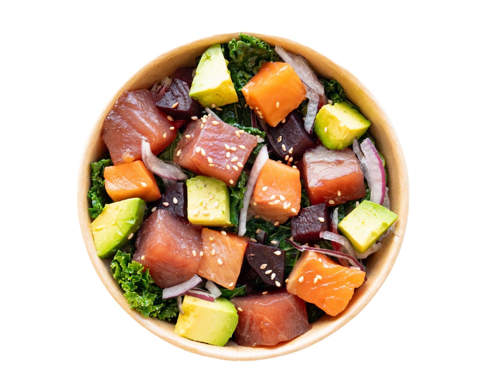 ハワイのポキ丼から着想を得たライスボウル。白米に十五穀米を混ぜて炊き上げたご飯をベースに、マグロとサーモンのポキは牡蠣醤油の特製ダレで漬け込み、海鮮の旨みを引き立てました。自社農園で育てたケールやビーツなどの西洋野菜とクリーミーなアボカドを合わせたひと口ごとに素材の旨みと彩りのバランスが楽しめるワンボウルです。