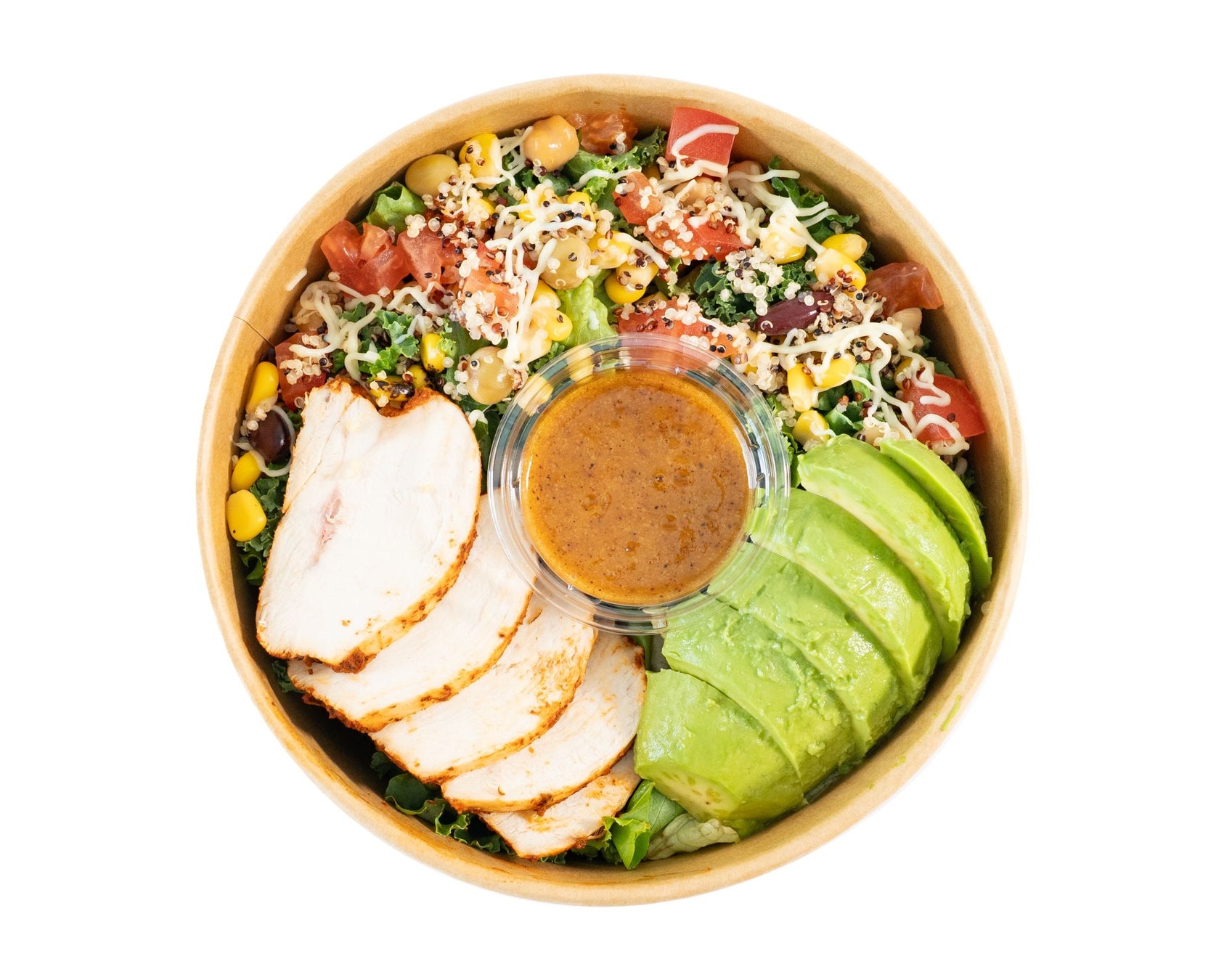 ケイジャンスパイスを効かせ香ばしくグリルしたチキンに、アボカドをトッピング。キヌア、トウモロコシ、トマト、ケール、レタス、チーズなど色鮮やかな食材をバランスよく組み合わせた人気のサラダです。スパイスの効いたコクのあるドレッシングが食材の旨みを引き立て、食欲をそそる味わいに仕上げました。