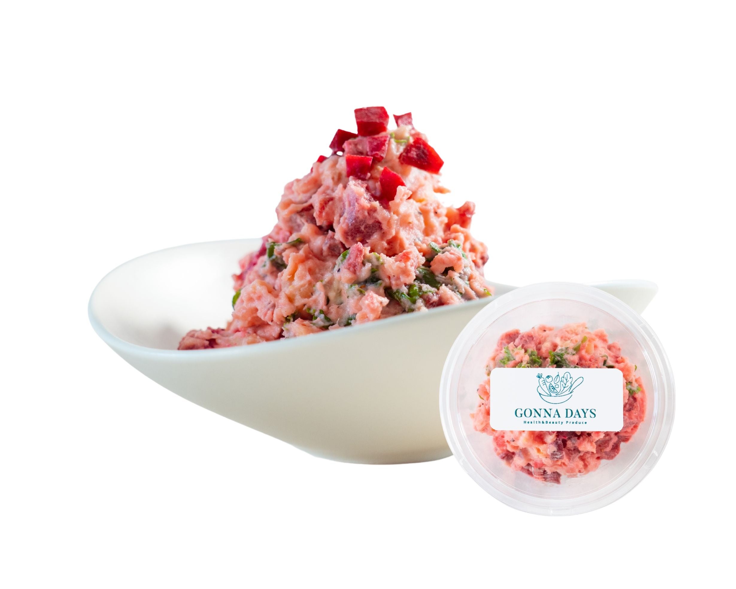 着色料を使わず、ビーツ本来の鮮やかなピンクが目を引く彩り豊かなポテトサラダ。日本の食卓におなじみのポテトサラダに、ミネラルや葉酸を豊富に含むと言われるビーツをたっぷり加えました。まろやかなマヨネーズがビーツのやさしい甘みを引き立て、やさしくコクのある味わいに仕上げています。