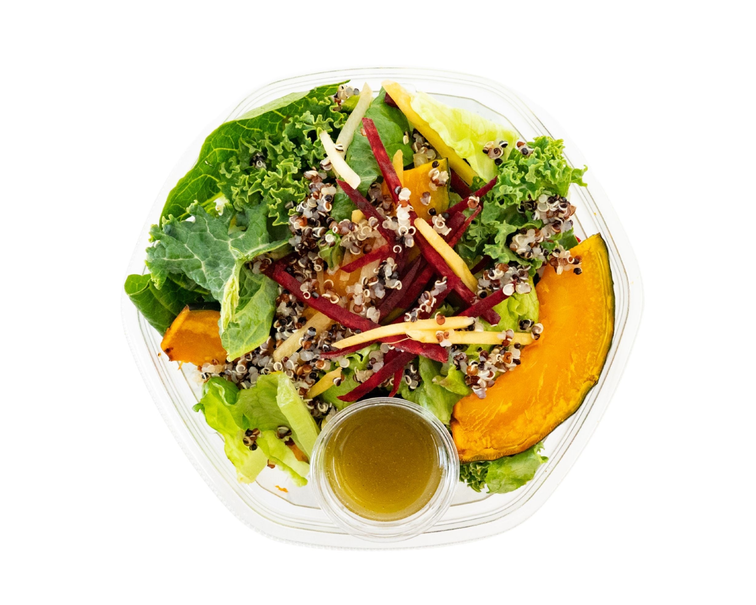 栄養豊富なケールと、スーパーフードとして知られるプチプチ食感のキヌアをたっぷり使ったベジタブルサラダ。ビーツやカラフルにんじんを加え、軽やかで飽きのこないおいしさに仕立てました。バジルを加えた爽やかなシトラスビネガードレッシングが野菜の味わいを引き立て、食べるほどに爽やかな香りが口の中で広がります。