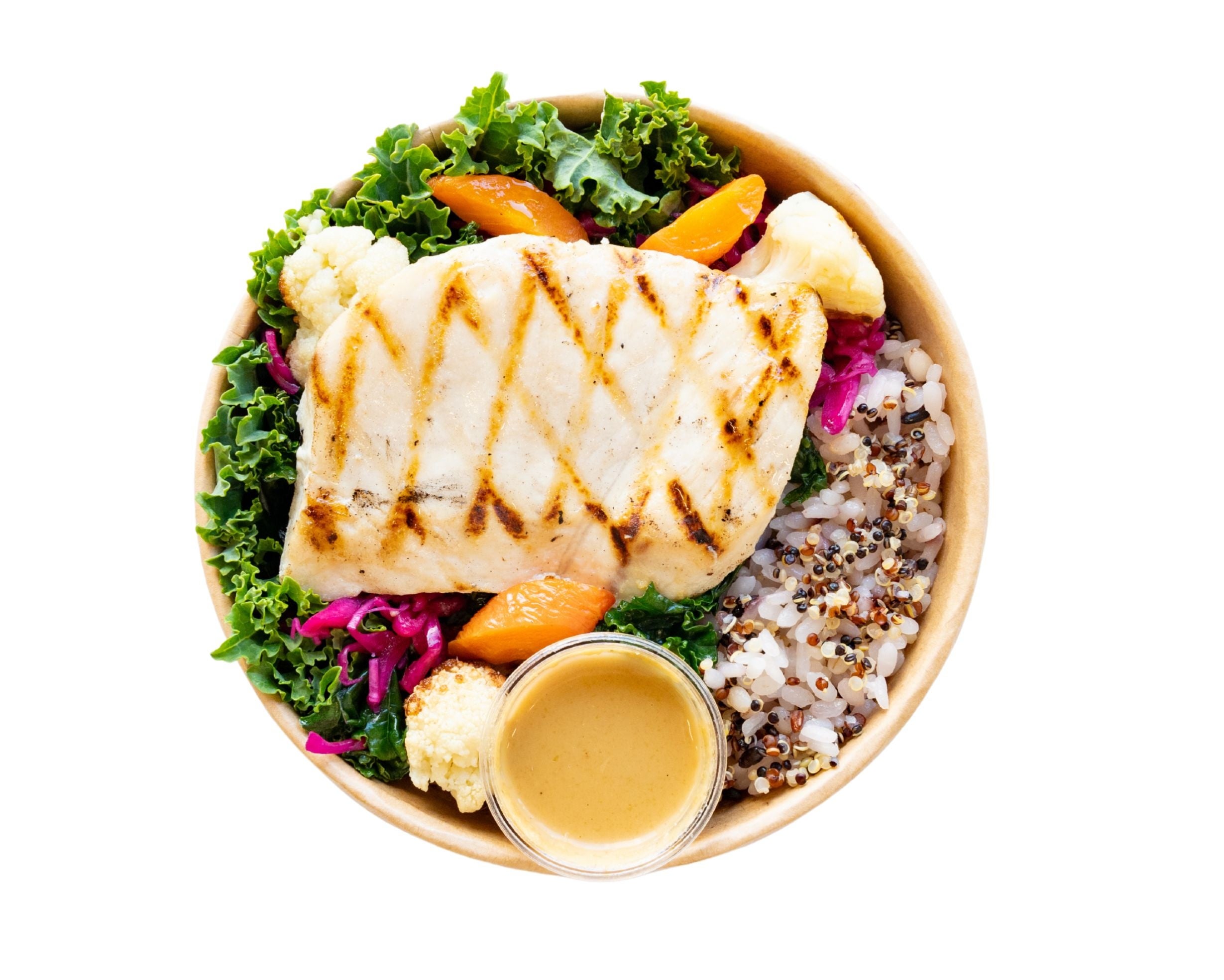 大きなメカジキと彩り豊かなグリル野菜、自社農園で育てたケールを組み合わせたライスボウル。白米に十五穀米を混ぜ炊き上げたご飯にキヌアを添え、メカジキは高温で短時間焼き、しっとりとした食感に仕上げました。醤油ベースの香味野菜ドレッシングが全体をバランス良い味わいにまとめ、ヘルシー&ボリュームのバランスも良く整えました。