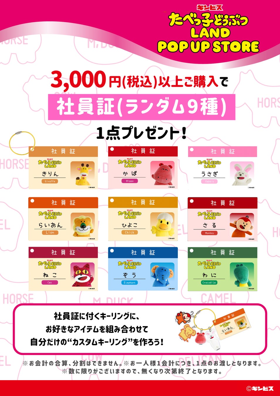 また、「たべっ子どうぶつLAND POP UP STORE」内で商品を税込3,000円以上購入すると、どうぶつさんの「社員証(全9種)」をランダムで1点プレゼントするお買い上げ特典もございます(※2)。社員証にはキーリングが付属しており、お好きなアイテムを組み合わせて、自分好みにカスタマイズすることができます。