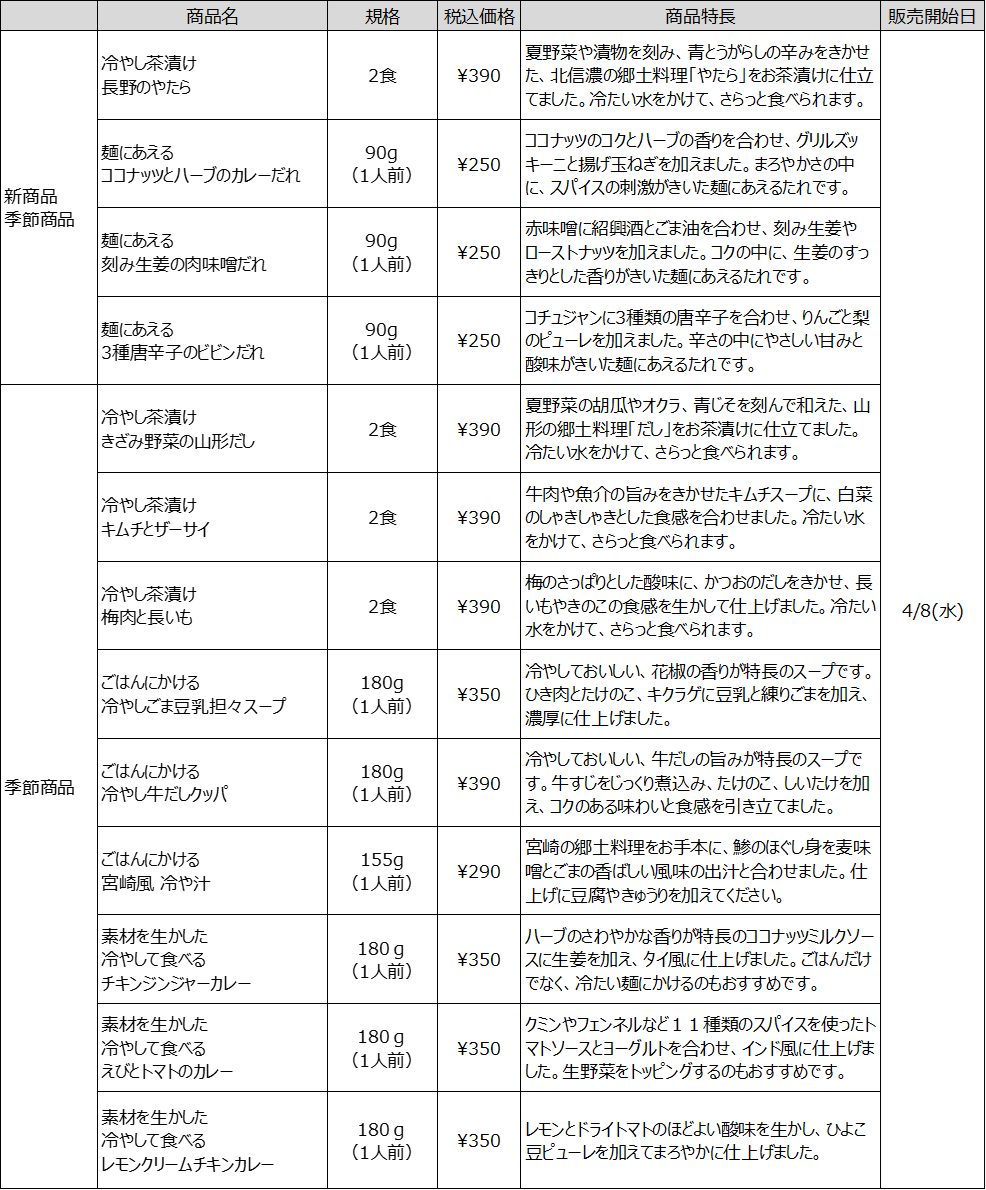 昨年好評いただいた「冷やし茶漬け」シリーズや新商品「麺にあえる」シリーズなどを展開