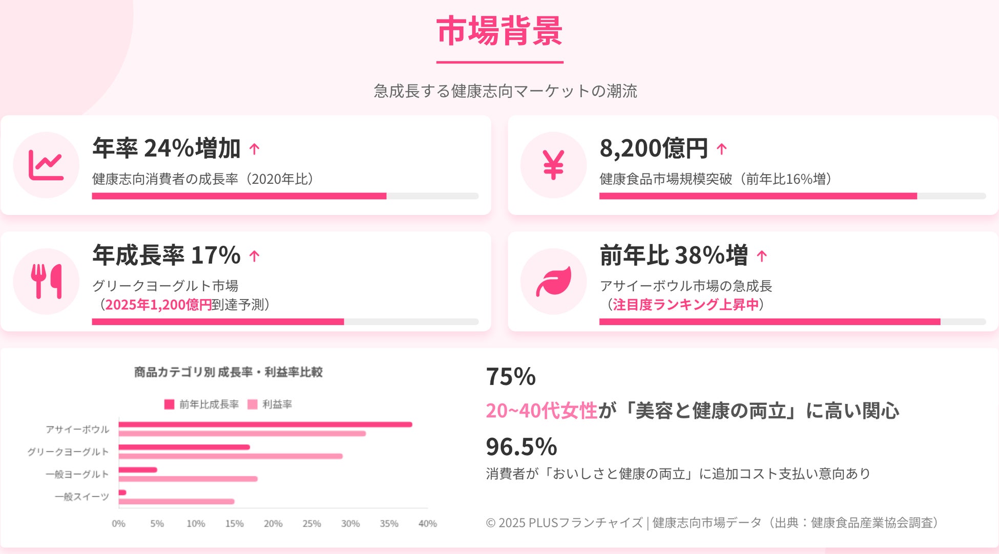 近年、ヘルシー志向の高まりやSNSでの拡散力を背景に、アサイーやグリークヨーグルト市場は拡大傾向にあります。その中でPLUSは「栄養×美味しさ×幸福感」を軸に、日常に取り入れやすい“ご褒美スイーツ”としてのポジションを確立し、女性を中心に幅広い層から支持され、全国各地での出店ニーズが高まっています。