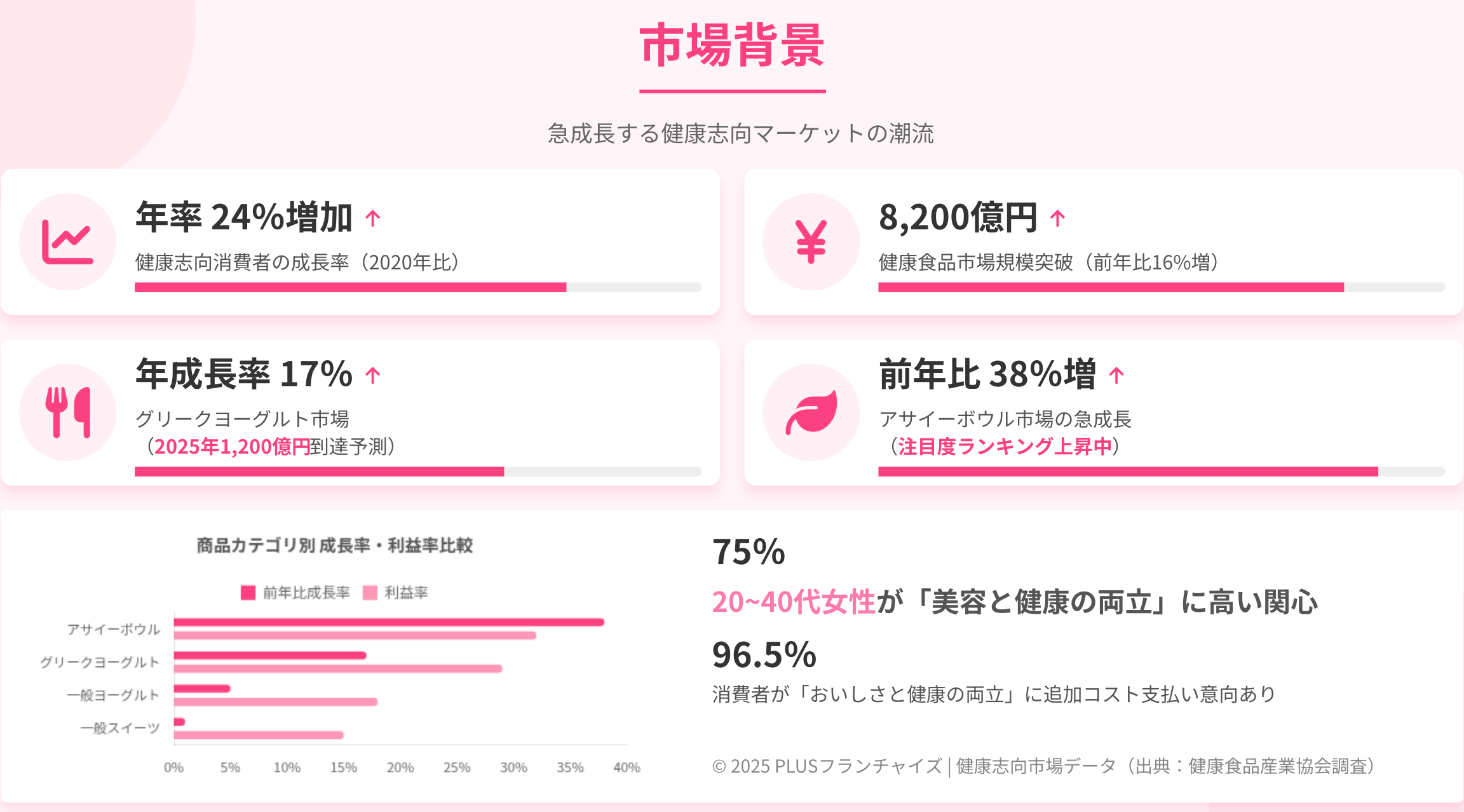 近年、ヘルシー志向の高まりやSNSでの拡散力を背景に、アサイーやグリークヨーグルト市場は拡大傾向にあります。その中でPLUSは「栄養×美味しさ×幸福感」を軸に、日常に取り入れやすい“ご褒美スイーツ”としてのポジションを確立し、女性を中心に幅広い層から支持され、全国各地での出店ニーズが高まっています。