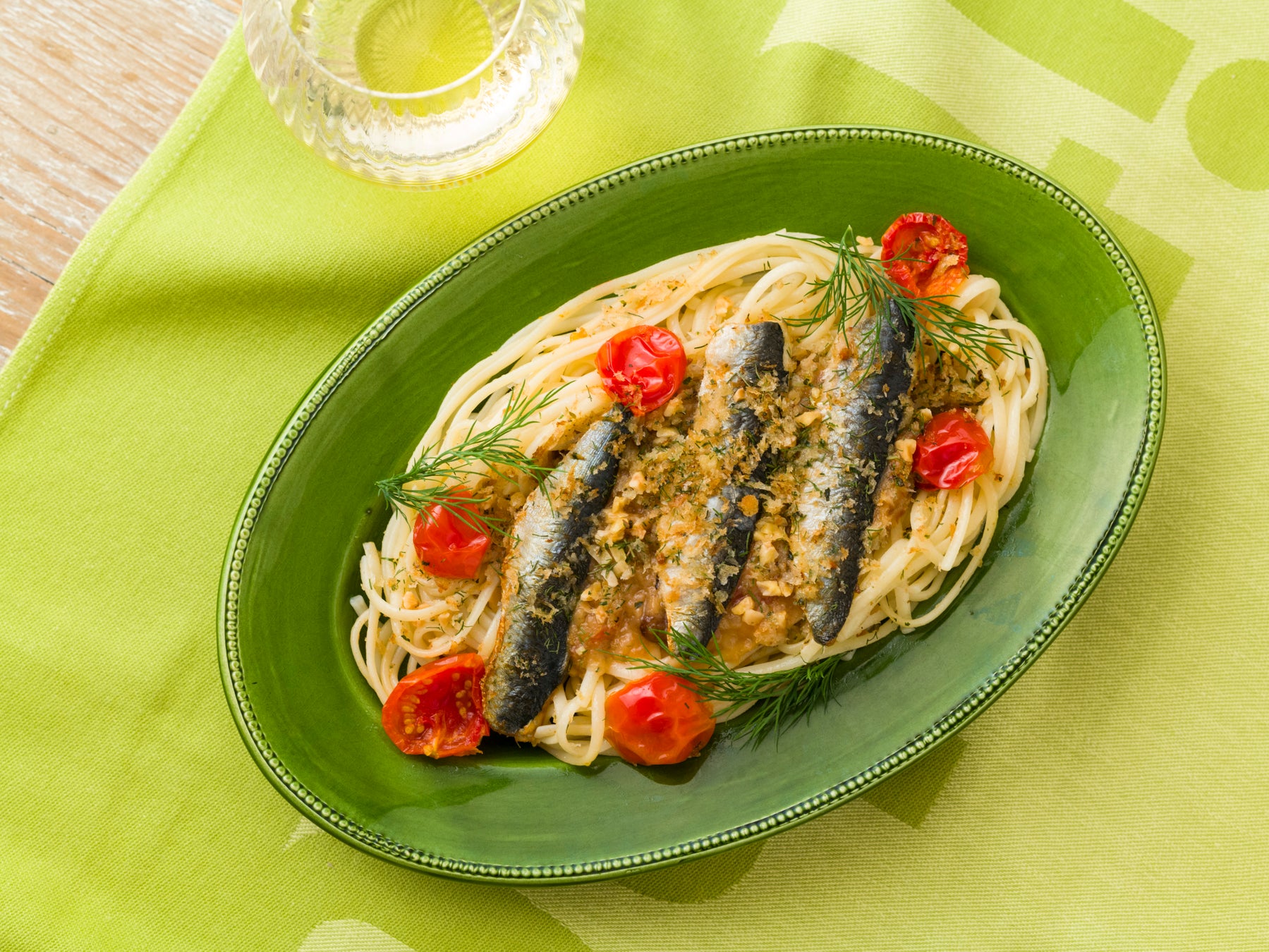 シチリアの伝統料理であるイワシのパスタを、現代的にアレンジした一皿。ソースにはイワシの塩味と調和するようにフェンネルシードやレーズンの甘みを加えています。具材が絡みやすいように麺は平打ちの「リングイネ」を使用。北海道産イワシは、ソースに混ぜ込むのではなくあえてトッピングすることで、見た目の華やかさとインパクトを付けました。トッピングには、弱火でじっくり炒めてパセリやタイム、オレガノの香りを移した特製の香草パン粉を散らしたほか、セミドライトマトで味に奥行きを与え、ディルを添えています。