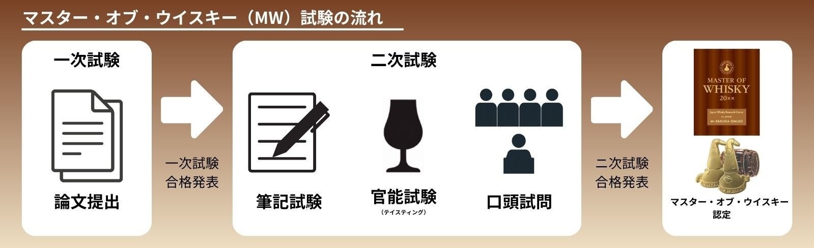 マスター・オブ・ウイスキー試験は、ウイスキー文化研究所が主宰する、ウイスキーに関するあらゆる知識、鑑定能力を問う資格認定制度の最難関試験です。一次試験の論文、二次試験の筆記試験、口頭試問、官能試験を経て認定されます。