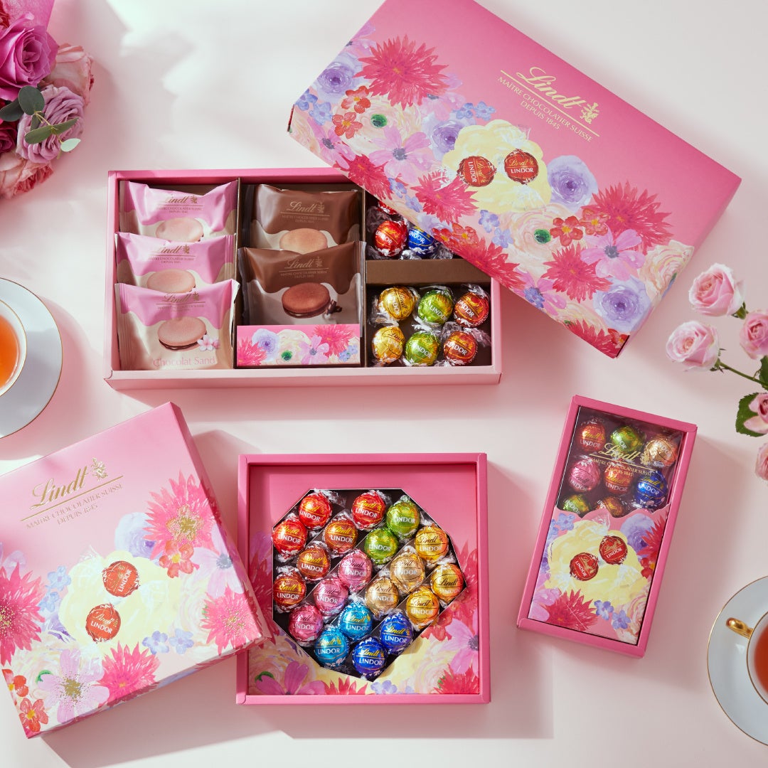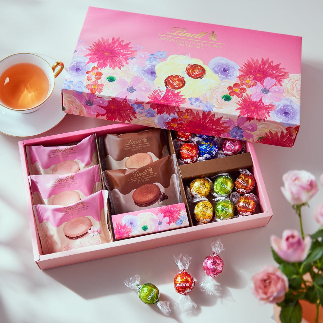 本アソートには、新登場の「ショコラサンド 桜」をはじめ、「ショコラサンド ミルク」「ショコラサンド 70%カカオ」、さらに人気のリンドールを詰め合わせました。とろける口どけとサクッとした食感、彩り豊かな味わいを一箱でお楽しみいただけます。母の日の特別感を演出する華やかなパッケージで、感謝の想いを伝えるギフトにふさわしい母の日コレクションです。