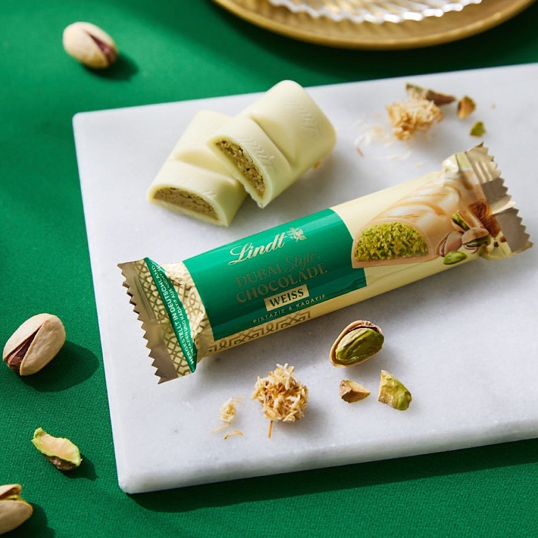 世界的なブームを巻き起こした「ドバイチョコレート」に着想を得て、リンツならではの特別なレシピでチョコレートのおいしさを徹底的に追求した、「リンツ ドバイスタイルチョコレート」のバータイプから、数量限定のホワイトチョコレートフレーバーが新登場。クリーミーでなめらかなリンツのホワイトチョコレートに、上質なピスタチオペーストと香ばしいカダイフ(乾麺)を贅沢に詰め込みました。気温が高まる時期にもぴったりな、軽やかなホワイトチョコレートの味わいをお楽しみください。