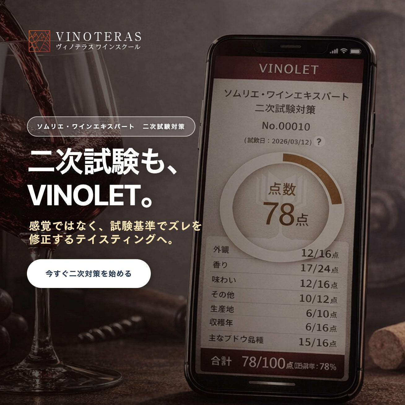 これまで一次試験対策としてご活用いただいていたWEB問題集アプリ「VINOLET」(ヴィノレット)に、新たに【テイスティング機能(二次試験対策)】が加わりました!
