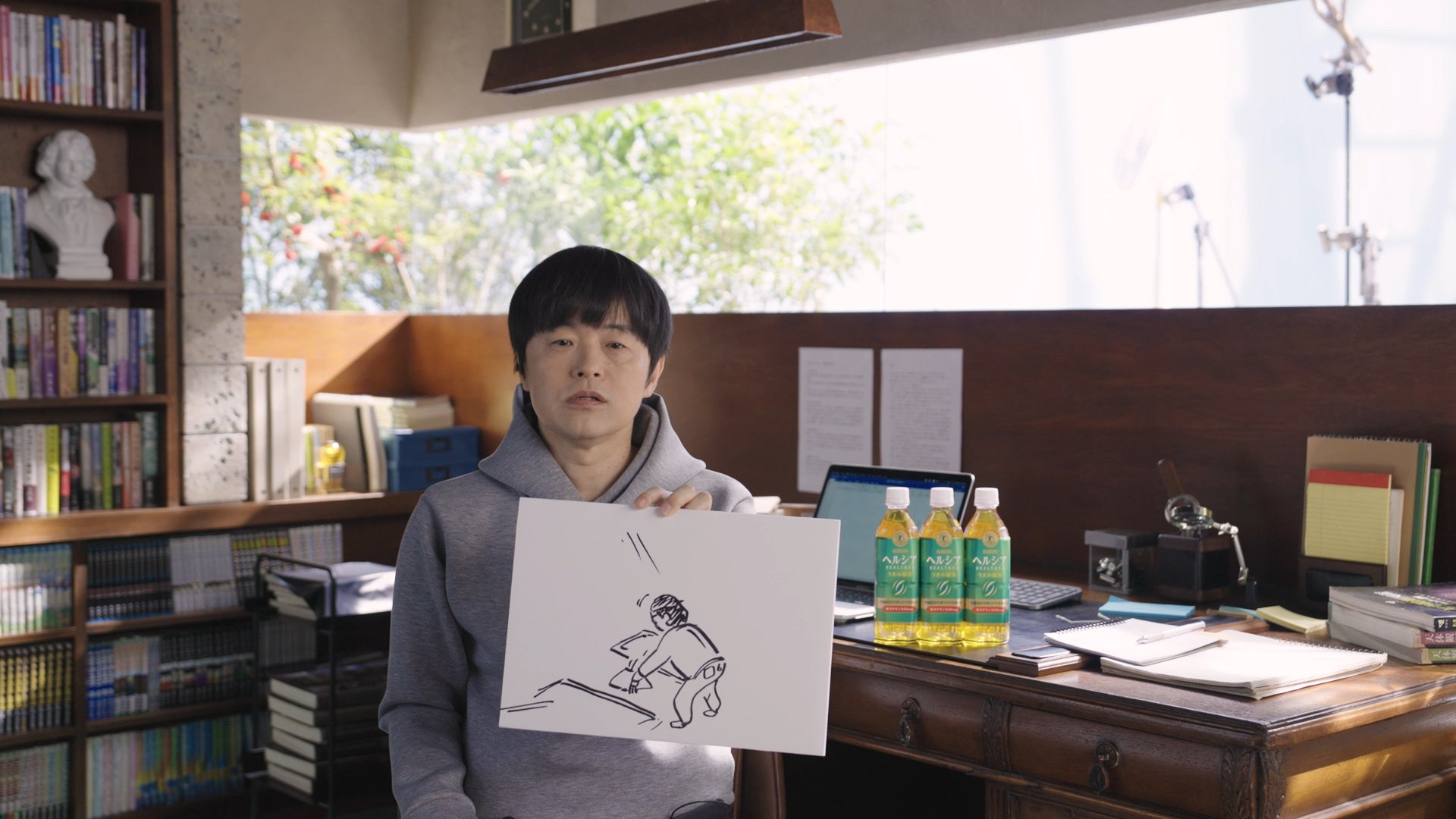 撮影にあたり、「とある架空の場所で脚本の執筆をしているという設定」「そこで、おもむろに『ヘルシア』を飲みます」と説明を受けたバカリズムさん。テストの映像を監督と一緒に見ながら一連の流れを把握し、「了解です」と力強く頷いてカメラ前に向かいました。