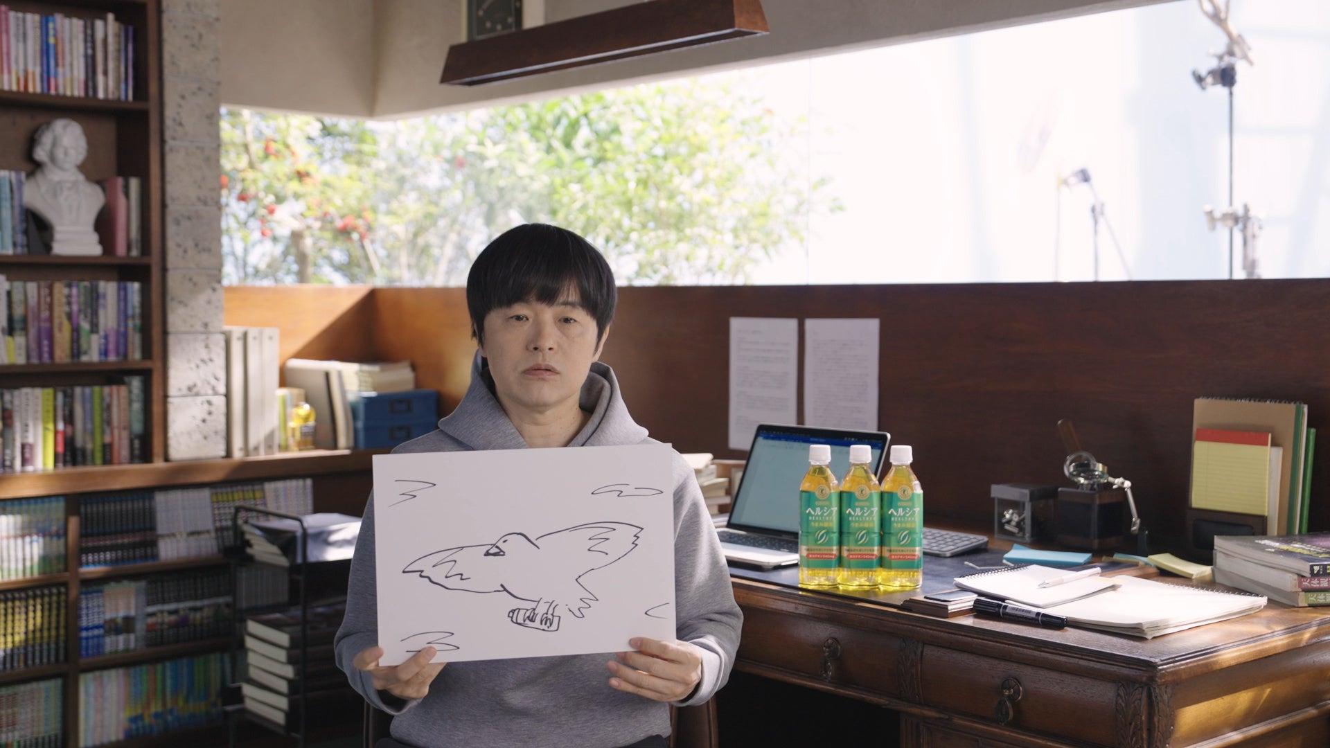 撮影にあたり、「とある架空の場所で脚本の執筆をしているという設定」「そこで、おもむろに『ヘルシア』を飲みます」と説明を受けたバカリズムさん。テストの映像を監督と一緒に見ながら一連の流れを把握し、「了解です」と力強く頷いてカメラ前に向かいました。