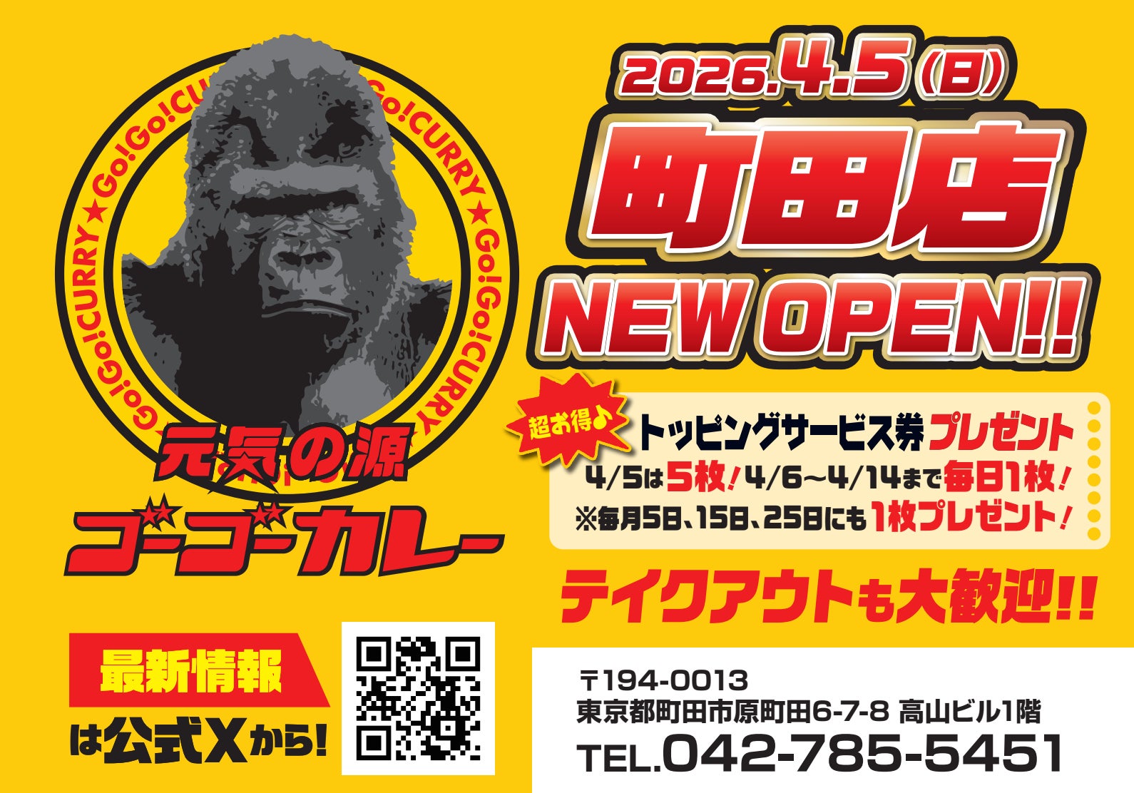 株式会社ゴーゴーカレーグループ(本社:石川県金沢市、代表取締役:西畑誠、以下 ゴーゴーカレー)は、2026年4月5日(日)に「ゴーゴーカレー 町田店」をオープンいたします。
