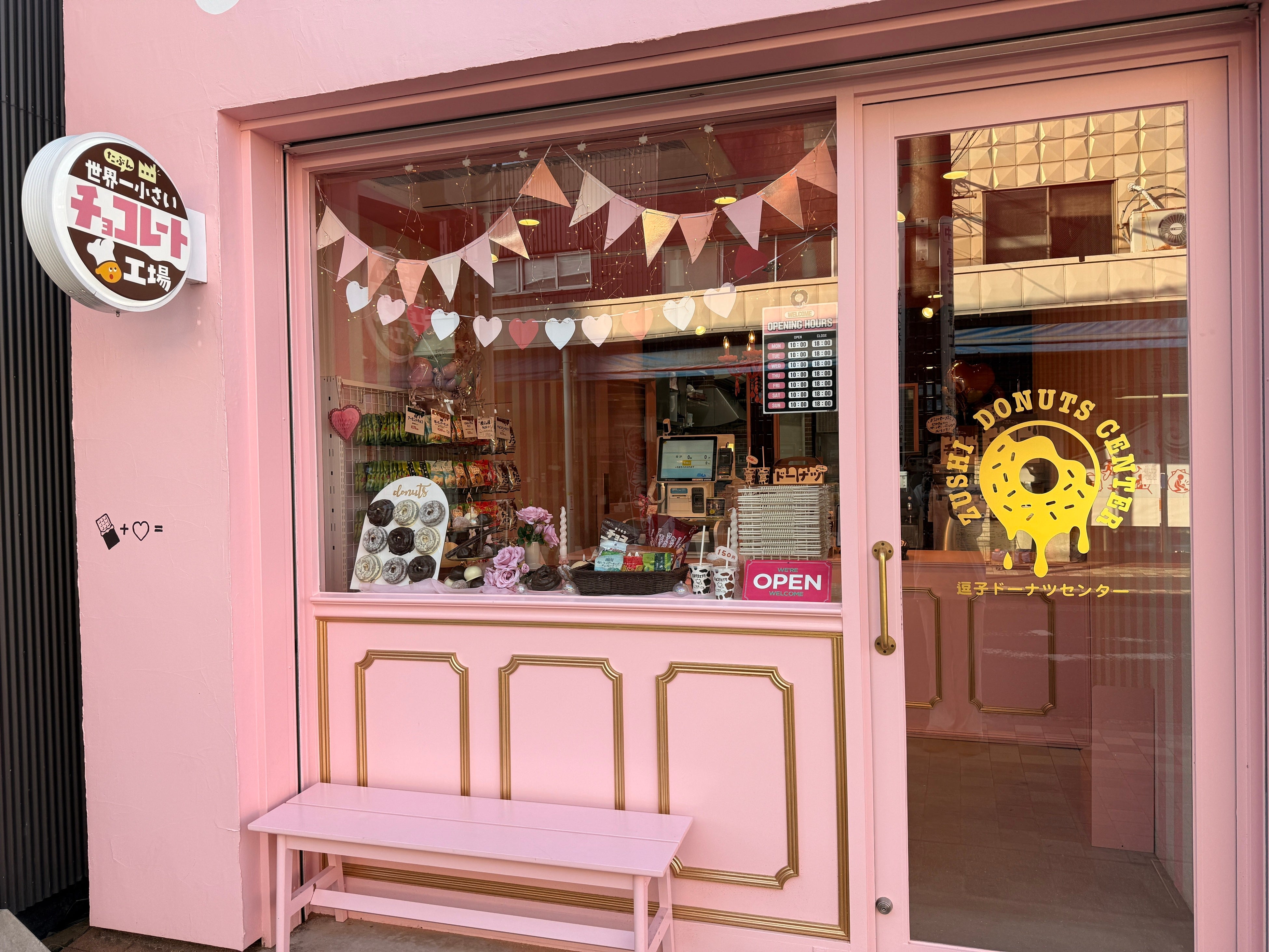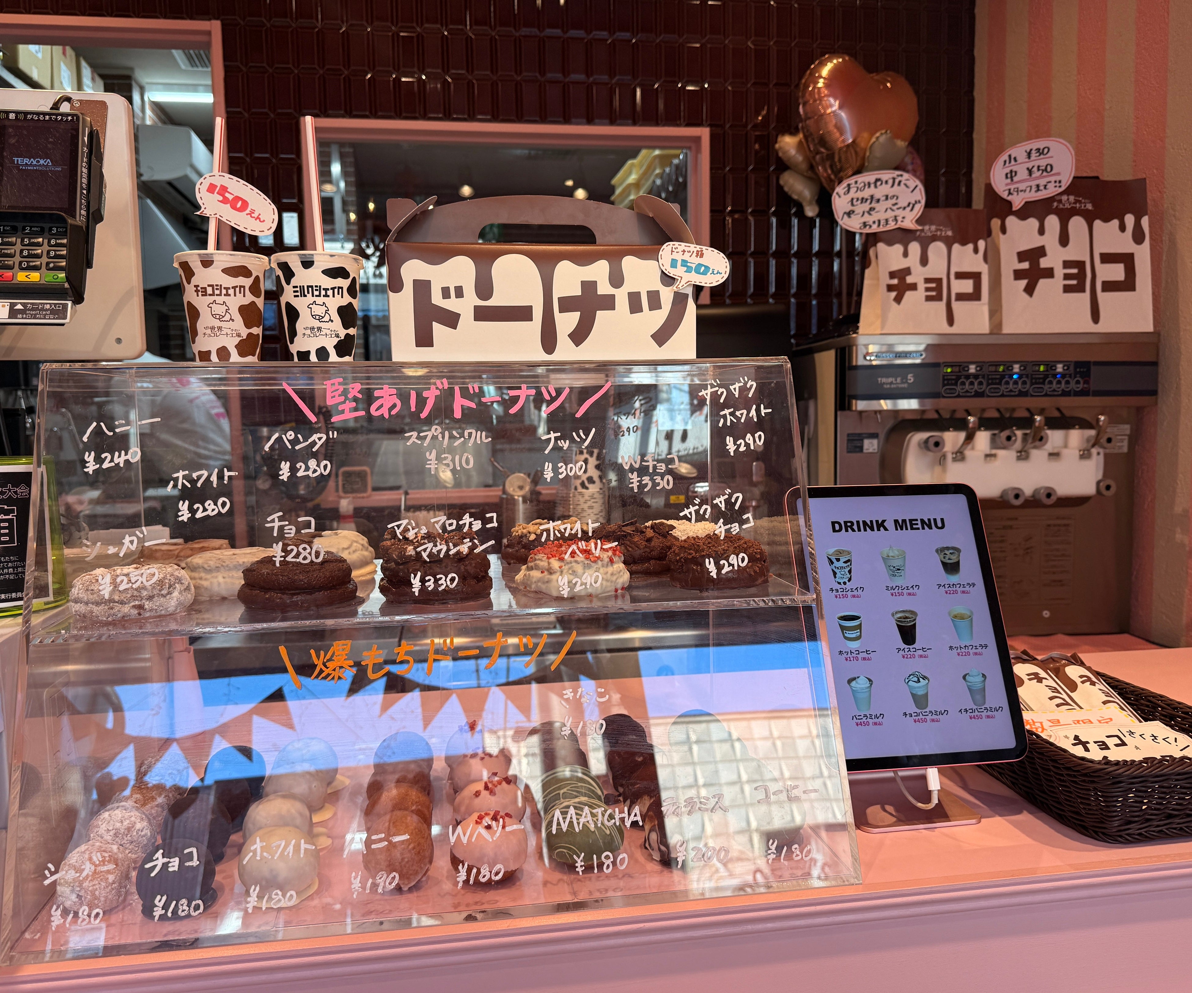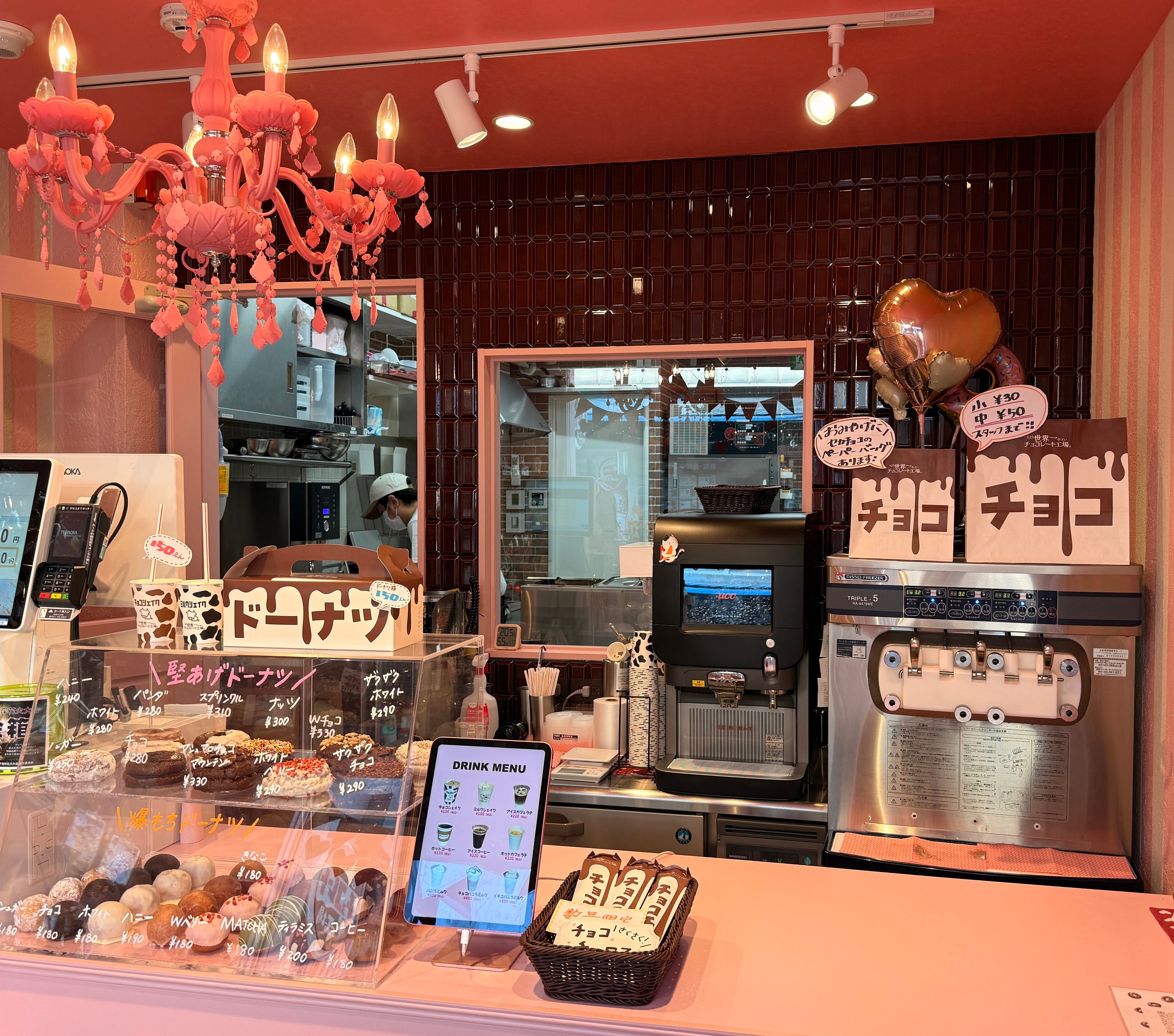 ピンクを基調とした可愛らしい店内。ドーナツやチョコレート商品が並ぶテイクアウト専門店