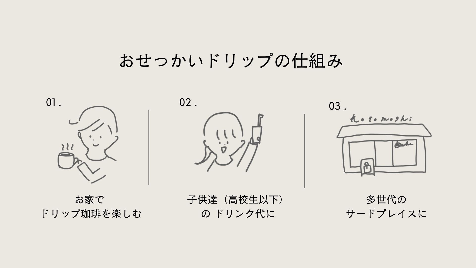 「おせっかいドリップ定期便」は、個人の暮らしの中で無理なく続けやすいことはもちろん、法人や施設での導入にも適したプロダクトです。 オフィスでの常備コーヒー、来客用、コワーキングスペースでの提供、地域イベントでの活用、法人ギフトなど、日常的にコーヒーが消費されるさまざまな場面に自然に導入できます。 本商品の特徴は、単にコーヒーを届けることにとどまりません。 日常的に消費されるコーヒーを本商品に置き換えることで、その売上の一部が地域の子どもたちや若者の居場所づくり、学びや挑戦の機会を支える原資として還元される仕組みになっています。