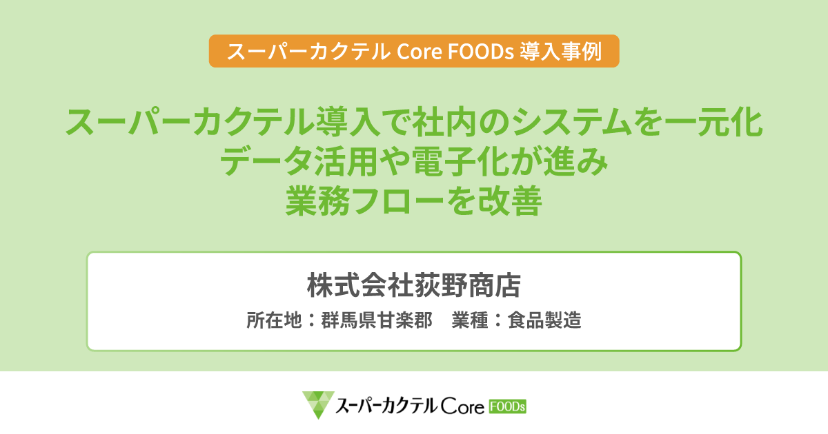 荻野商店は、オフコンの保守終了を見据えて基幹システムの刷新を検討し、「スーパーカクテルCore FOODs」を採用しました。業務の棚卸を行い、商慣習を踏まえた最小限のカスタマイズで仕入から販売までを一元化。クラウドツールとの連携により紙業務の電子化も進め、業務効率化とデータ活用の両立を図っています。