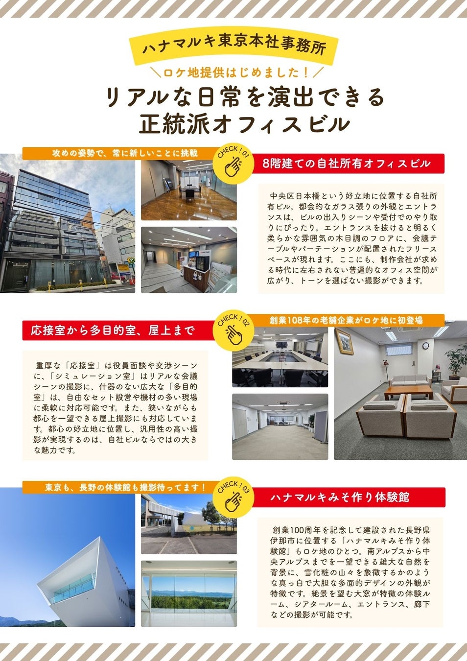 ロケ地提供サイト「Tロケ」を運営する東日印刷株式会社(本社:東京都江東区、社長:西川 光昭 以下、TONICHI)は、味噌・醸造製品の大手メーカー、ハナマルキ株式会社(住所:東京都中央区、代表取締役社長:花岡周一郎 以下、ハナマルキ)の東京本社事務所をロケ地として新たに登録、提供を開始しました。ハナマルキの登録物件としては、長野県伊那市の「みそ作り体験館」に続き2件目となります。また、本件はSNS「X」での交流をきっかけに実現したビジネスマッチングの3例目となります。