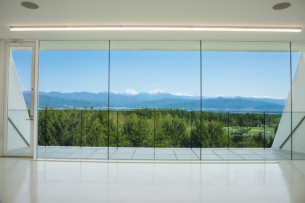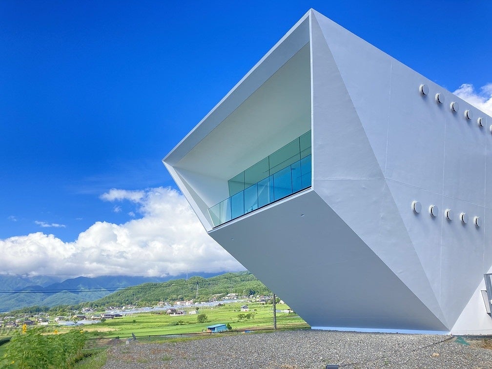 創業100周年を記念して建設された長野県伊那市に位置する「ハナマルキみそ作り体験館」もロケ地のひとつ。南アルプスから中央アルプスまでを一望できる雄大な自然を背景に、雪化粧の山々を象徴するかのような真っ白で大胆な多面的デザインの外観が特徴です。絶景を望む大窓が特徴の体験ルーム、シアタールーム、エントランス、廊下などの撮影が可能です。