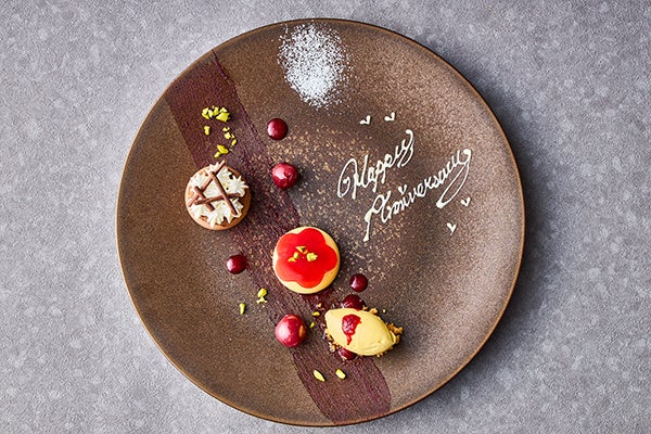 魚介をふんだんに使った花束を思わせる彩り豊かなオードブルをはじめ、香り高いバジルソースにあさりの凝縮した旨みを重ねたジェノベーゼパスタ、香ばしく焼き上げた牛肉の芳醇な旨みをコク深いグレイビーソースと合わせたサーロインのポワレ、そしてココア生地とグリオットチェリー、キルシュ、生クリームを使用したドイツ発祥の伝統菓子「フォレノワール」を小菓子のように一口サイズにして愛らしく盛り付けたデザートまで、全4品をご用意いたします。デザートプレートには大切な想いを乗せたメッセージを添えてご提供いたします。種類豊富なフリーフローを楽しみつつ、高層階から望むきらめく夜景に包まれながら、大切な記念日やお誕生日をお過ごしください。