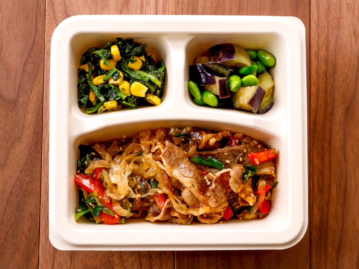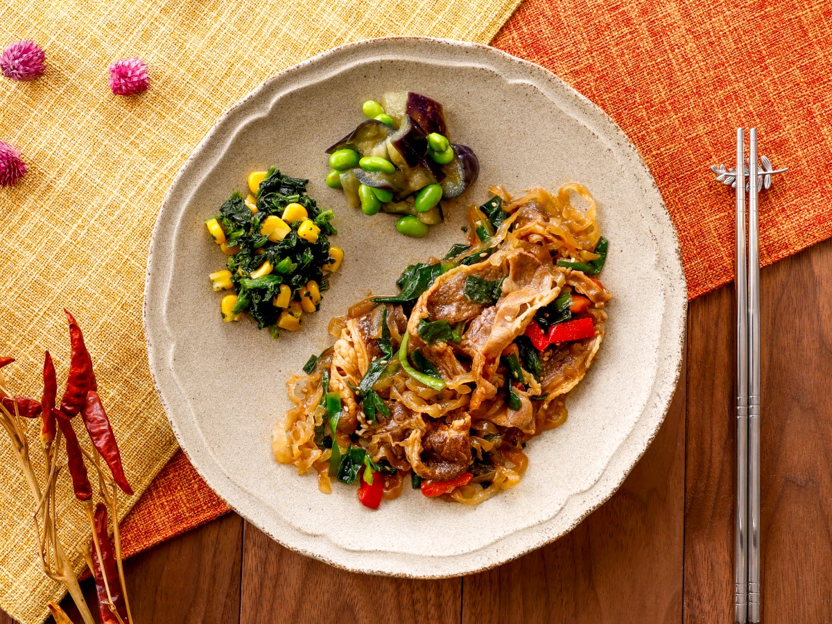 韓国料理のチャプチェから着想を得て、nosh風にアレンジした一皿です。本来は春雨を使うメニューですが、糖質を抑えながらも美味しくお召し上がりいただけるよう、シェフ特製のこんにゃく麺を採用しました。 冷凍・レンジ加熱後もプリッとした食感を保ち、こんにゃく特有のにおいも気になりません。タレをしっかりと抱き込む平打ち麺に仕立てることで、妥協のない満足感のある食べ応えを実現しています。牛肉と彩り野菜に食欲をそそる旨辛ダレが絡むメインに、副菜には、やさしい味わいの「ほうれん草コーンナムル」と、さっぱりとした「茄子と枝豆のサラダ」を添えました。