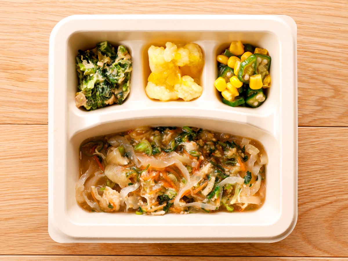 noshのお弁当の中で、最もエネルギーを抑えた「169kcal」を実現。「今日は軽めに抑えたい」という日にぴったりのメニューです。 主菜には、つるりと喉ごしの良いこんにゃく麺と、しっとり仕上げた蒸し鶏、さらにたっぷりの小松菜を合わせ、まろやかな胡麻ぽん酢でコク深く仕上げています。