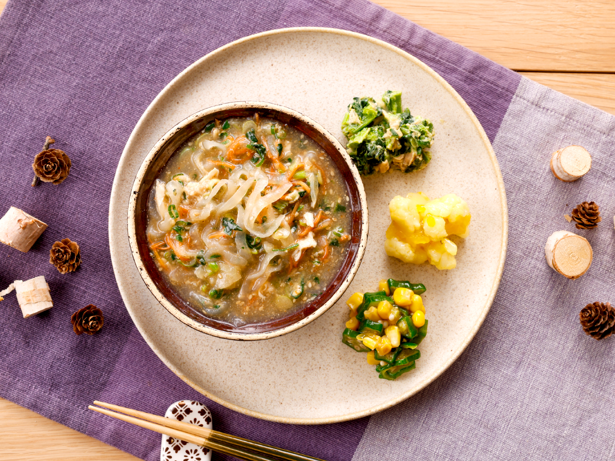 副菜には「菜の花のツナマヨ」「カリフラワーと沢庵のあえ物」「オクラとコーンの牡蠣だし醤油」をご用意。多彩な野菜の食感と出汁の旨みを存分にお楽しみいただけます。