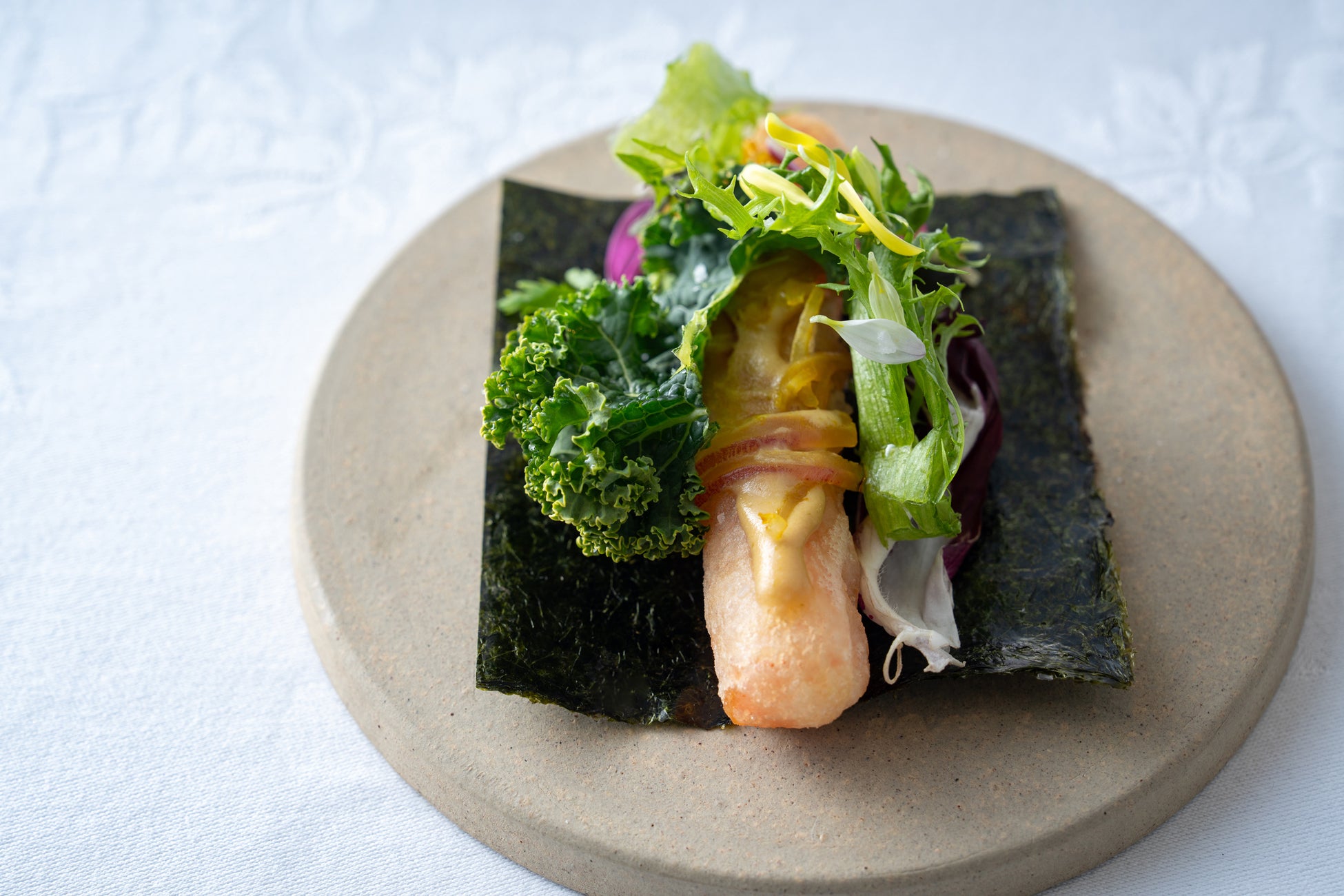 実演では、素材ごとに最適化した衣設計や油温管理、食材選択への配慮といった調理思想に触れながら、天ぷらを単なる揚げ料理としてではなく体験価値として提示。また、一部の提供では手で食べるスタイルを取り入れ、食べ方を含めた新しい食体験の提案を行いました。