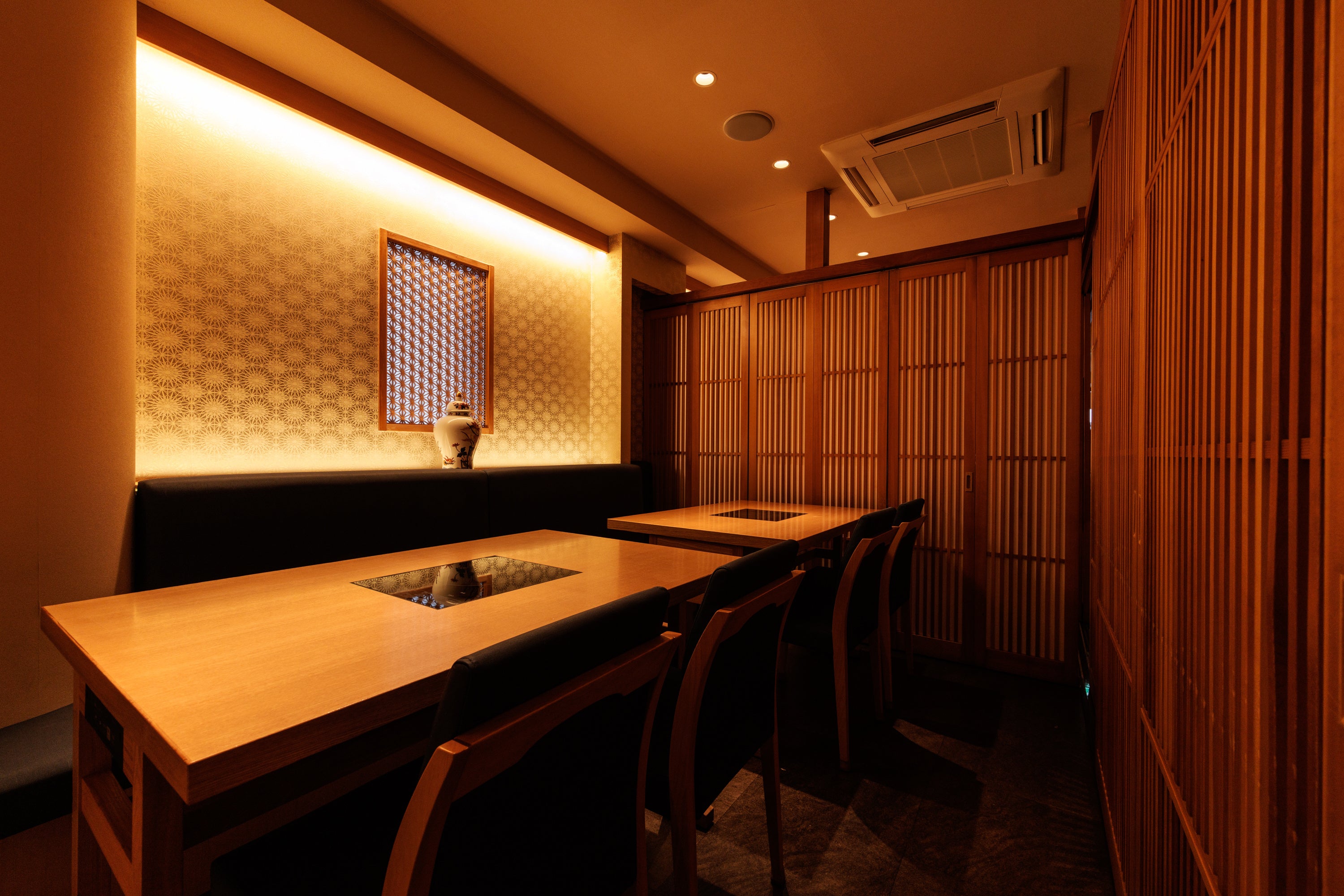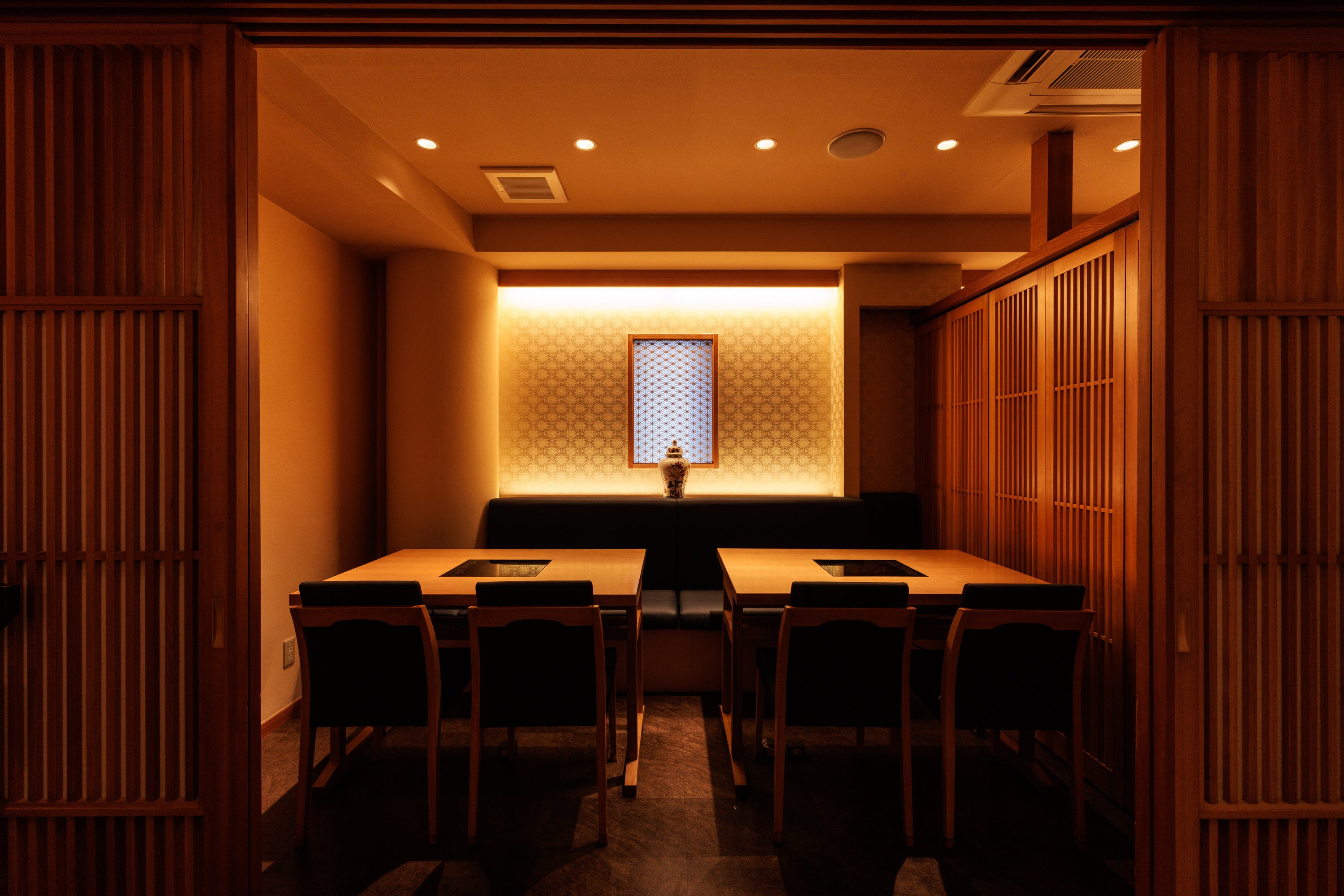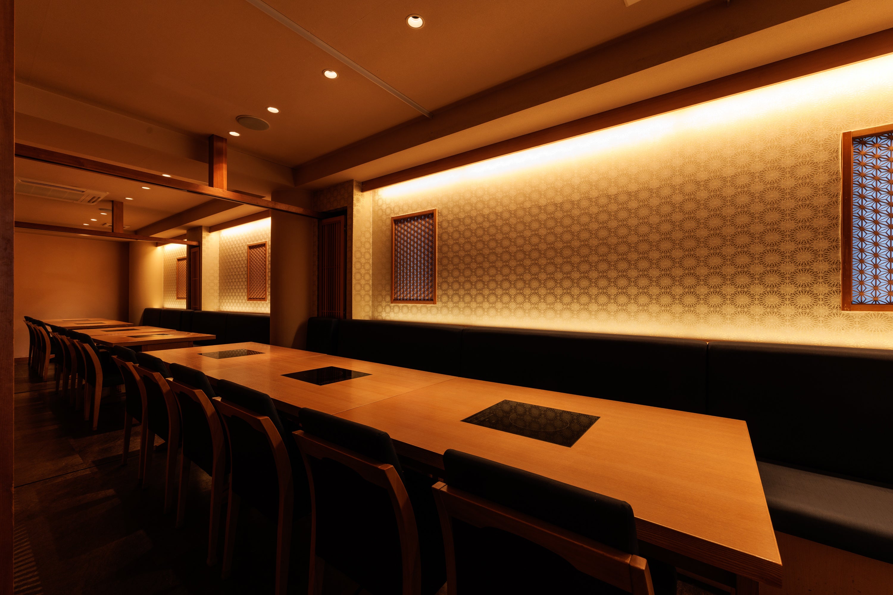 店内は、木の温もりと柔らかな灯りに包まれた上質な和の空間。落ち着いた個室を中心に、大切なひとときをゆったりとお過ごしいただけます。