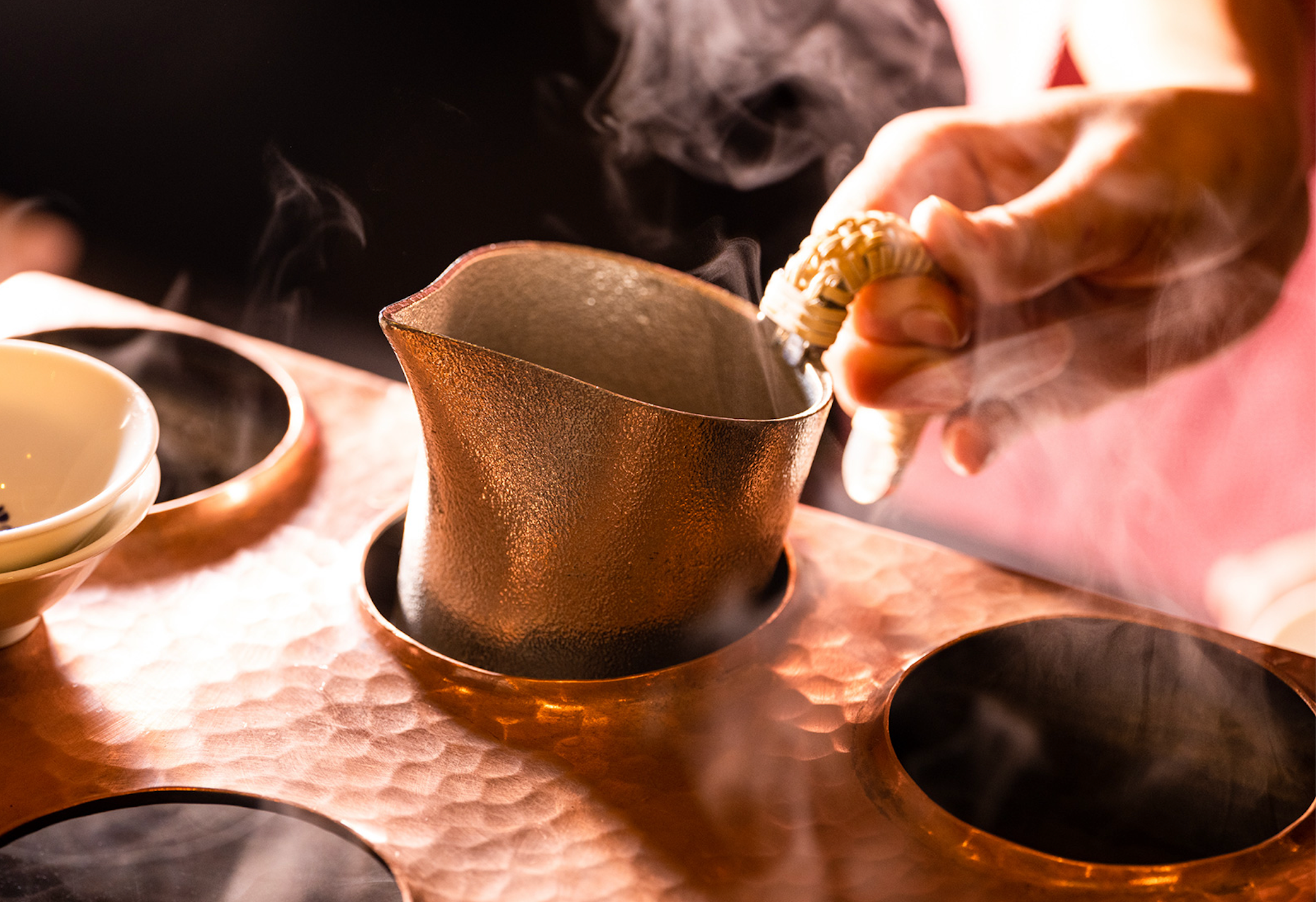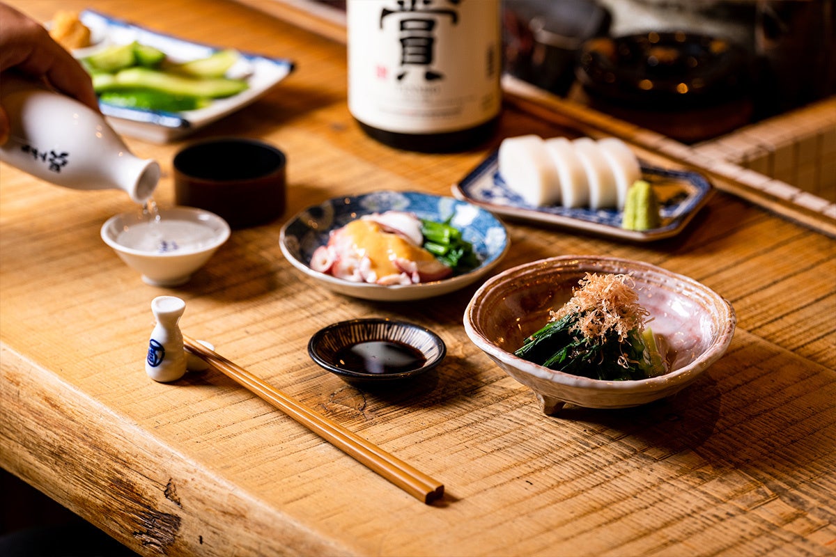 日本酒は利き酒師が厳選したラインナップを取り揃え、錫のチロリで、それぞれの酒質に合わせて丁寧に温めてご提供。温度帯ごとに移ろう繊細な味わいをお楽しみいただけます。