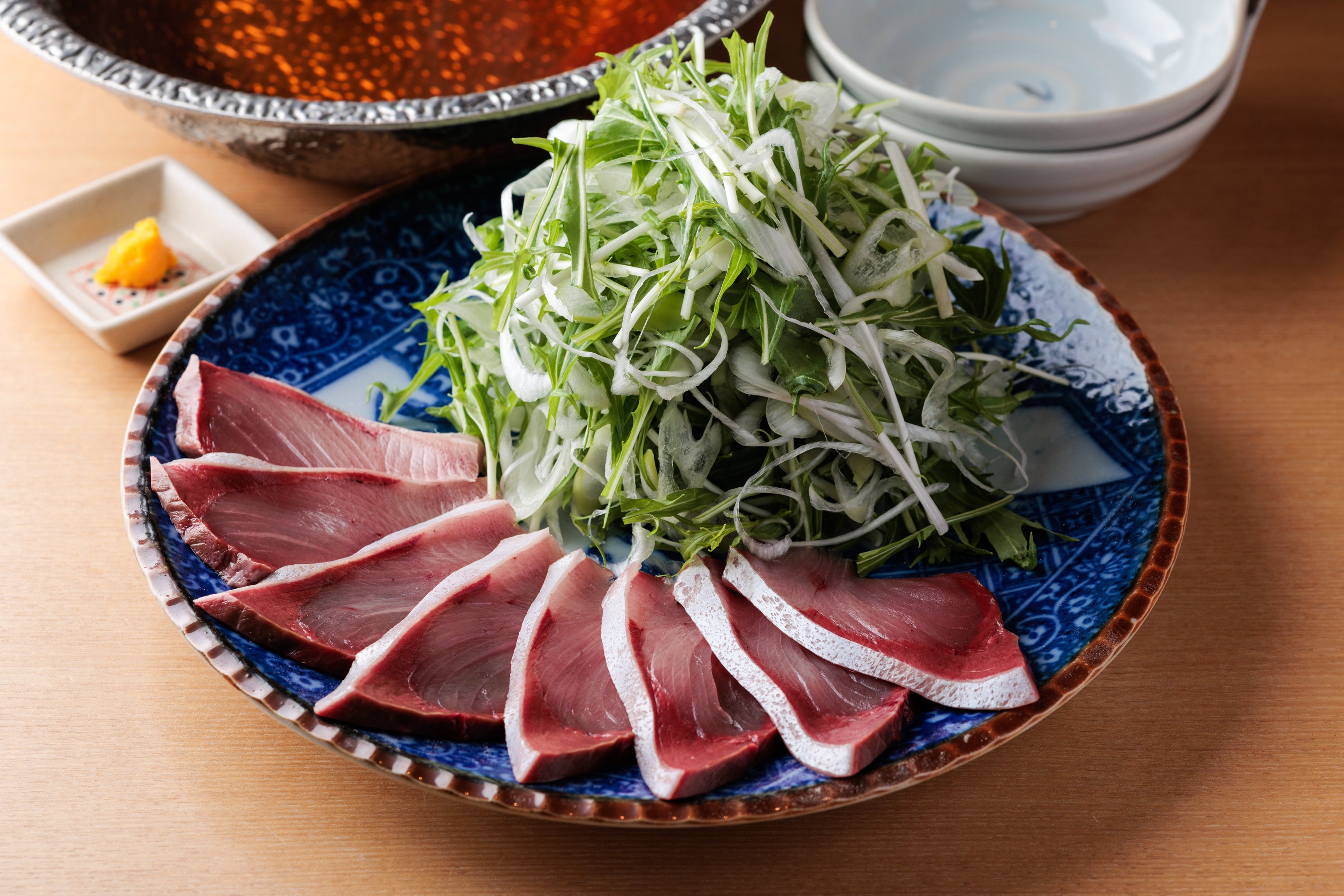 たっぷりの葱と旨み溢れる特製出汁が決め手。新鮮な鮪をさっと潜らせて味わう香りとコクが広がる自慢の逸品。