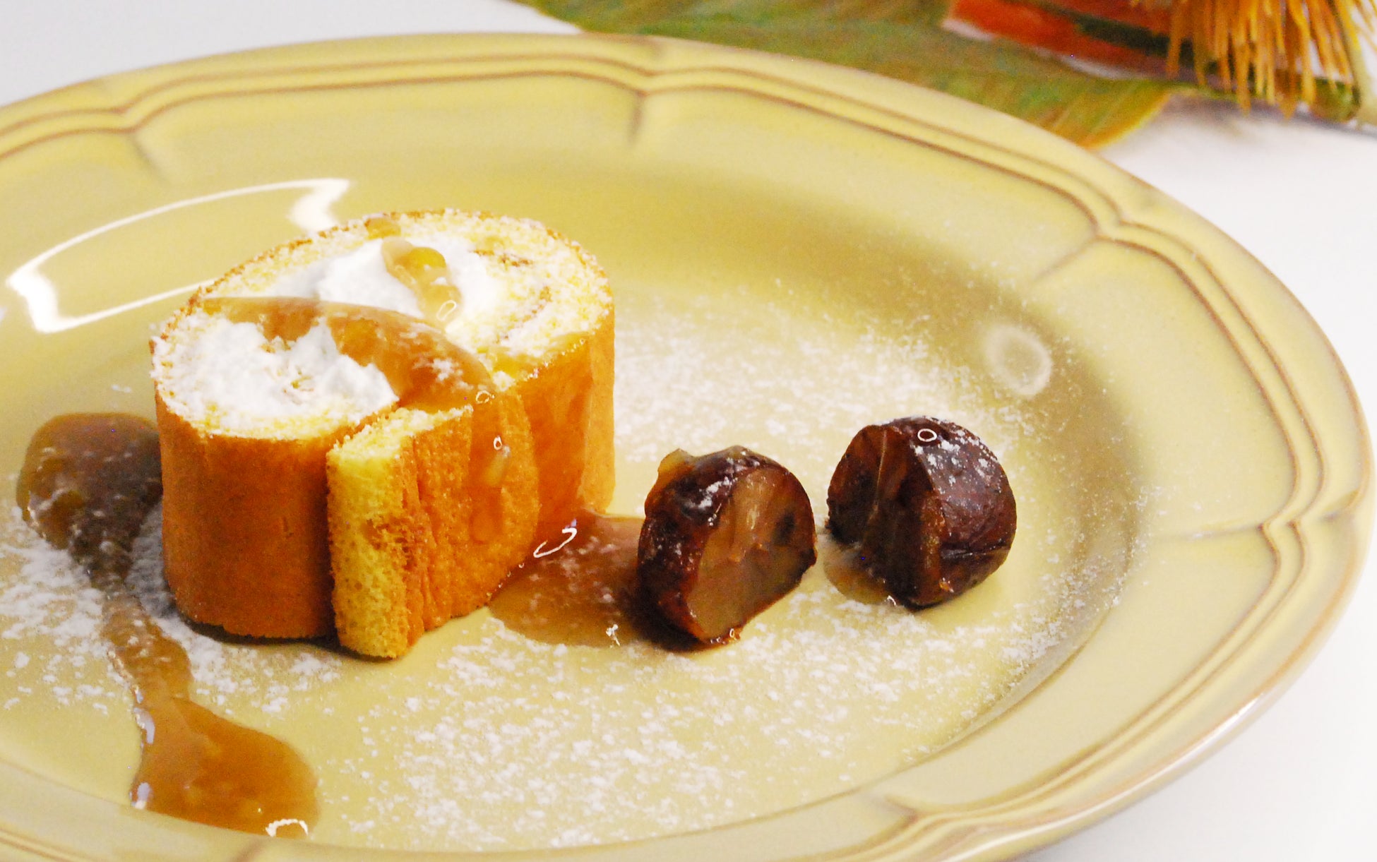プレーンロールケーキに「和栗ソース(国産栗)」をトッピング。