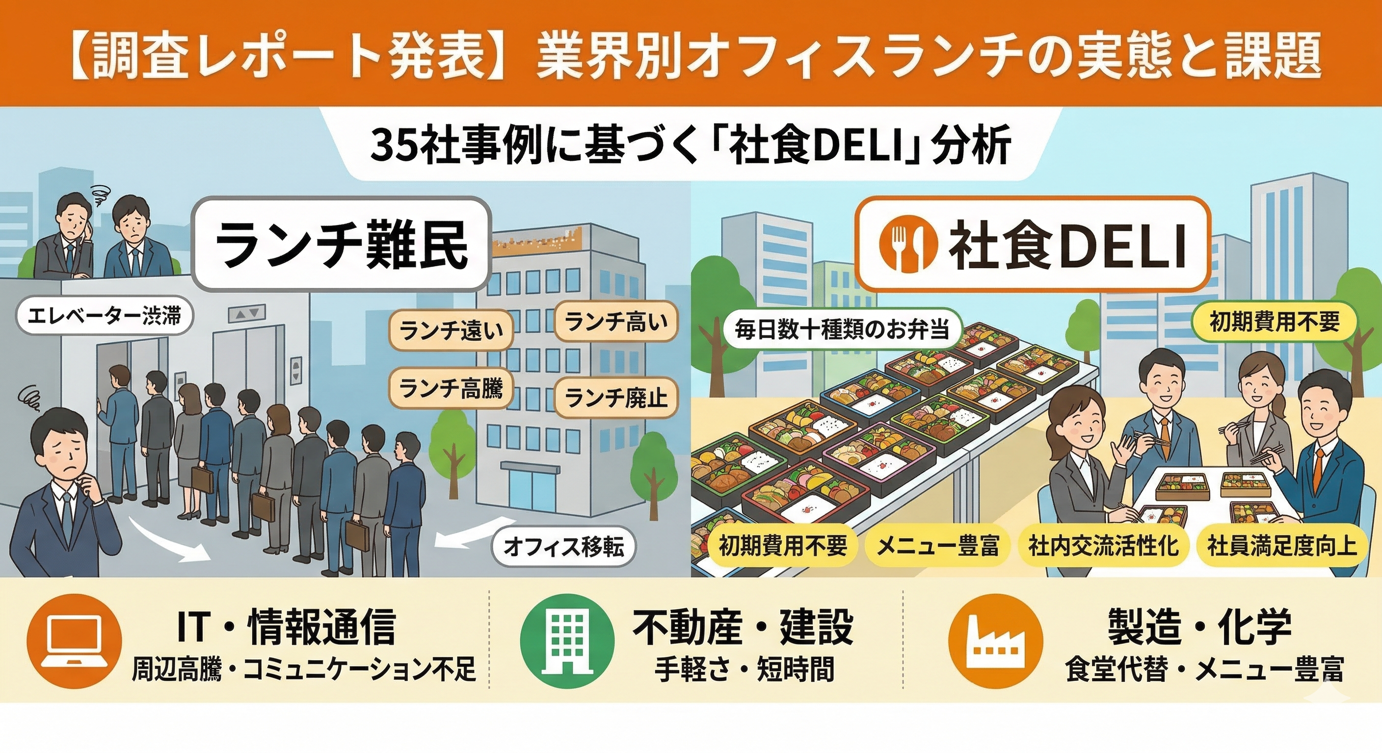 近年、都心部の再開発に伴うオフィス移転や、リモートワークと出社を組み合わせたハイブリッドワークの定着により、オフィスのあり方が大きく変化しています。それに伴い、社員の「ランチ環境」にも新たな課題が生まれています。本調査では、社食DELIを導入した企業のうち、インタビューを受けてくださった35社の抱えていた課題を分析し、現代のオフィスランチの実態を浮き彫りにしました。