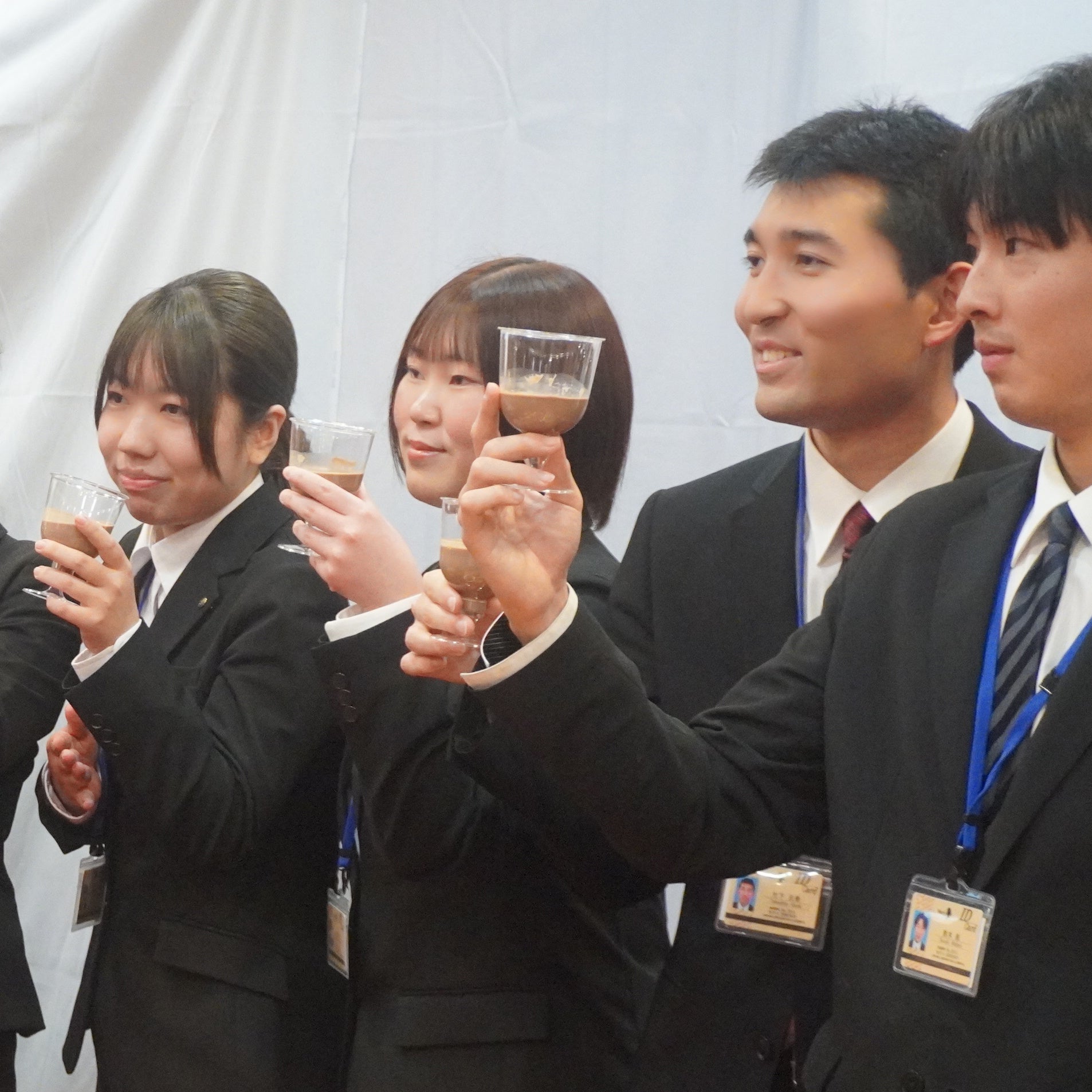 研究開発部 奥谷ショコラティエ考案による特製ハーブ入りチョコレートドリンクで乾杯。奥谷ショコラティエからは、新社会人の緊張緩和におすすめのレシピが紹介され、参加者全員で「チョコで乾杯!」と高らかに杯を上げました。お酒ではない新しい乾杯スタイルは、参加者の心を温め、会場を一体感で包みました。
