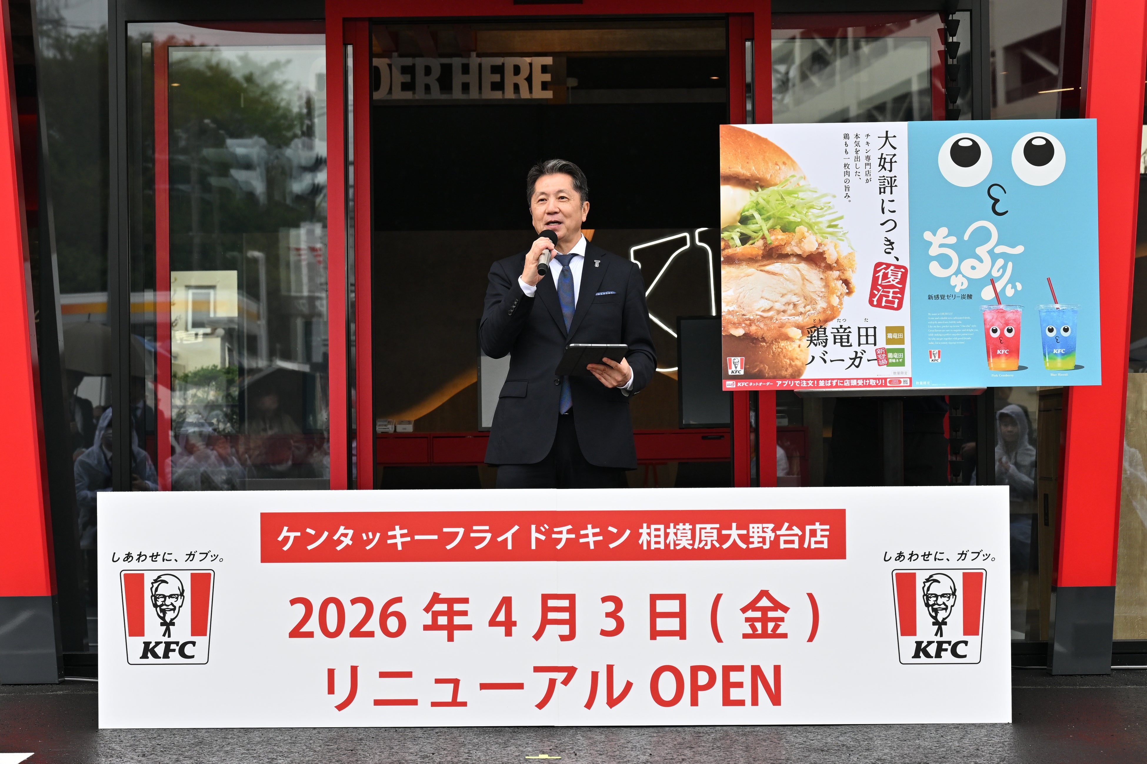 日本ケンタッキー・フライド・チキン株式会社(社長:名嶋 篤史、以下:日本KFC)は、4月2日(木)に「KFC 次世代モデル店舗 相模原大野台店 オープニングセレモニー&新商品『ちゅる~りぃ』発表会」を開催しました。イベント当日は、遠藤CEOが次世代モデル店舗「相模原大野台店」の特徴について紹介したほか、商品開発担当者より新商品「ちゅる~りぃ」について説明しました。さらに、人気コスプレイヤーのえなこさんがゲストとして登場し、「1日店長」就任セレモニーや新商品の試飲、テープカットなどを行い、会場を華やかに彩りました。