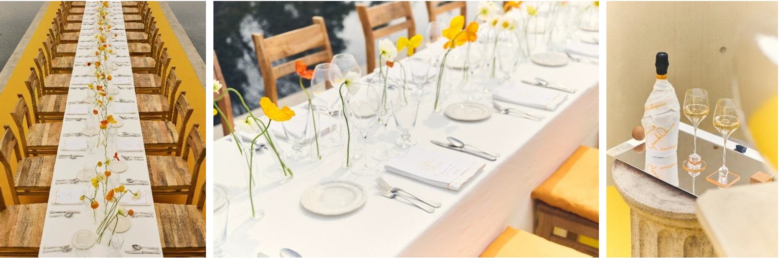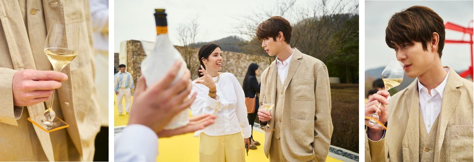 会場となったのは、建築家 安藤忠雄が手がけた「ミュージアムSAN」。南フランスの夏のマーケットをイメージした「Le Marché(ル・マルシェ)」をコンセプトに、自然光と建築美が織りなす、ミニマルかつ詩的な空間が広がりました。この空間の中で、ヴーヴ・クリコが掲げる〈アール・ド・ヴィーヴル(美しく豊かに生きる喜び)〉は新たなかたちで表現され、ジャックムスの美学とヴーヴ・クリコの“ソレール(太陽のような輝き)”の精神が響き合う、没入型のブランド体験が創出されました。また会場では、コラボレーションを象徴するイエローリボンが空間全体に配され、自然、連続性、そして人と人とのつながりを表現する象徴的なビジュアルコードとして演出されました。ヴーヴ・クリコのCEO、トマ・ムリエは次のように述べています。「ミュージアムSANは、ヴーヴ・クリコとジャックムスが共有する価値観を体現する理想的な舞台でした。都市の喧騒から離れたこの場所は、創造性と韓国の文化的景観に新たな視点をもたらし、私たちの〈ソレール アール・ド・ヴィーヴル〉を祝うにふさわしい空間です。」さらに、ピアニスト イルマによるライブパフォーマンスや、パリを拠点に活躍するシェフEsu Leeによる特別なランチが振る舞われ、ブランドの世界観を体感するひとときが創出されました。来場者は五感を通して、両者の世界観を深く体感するひとときを過ごしました。