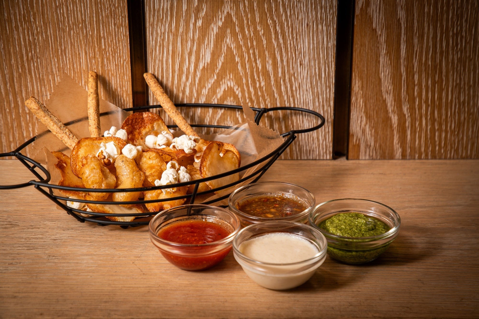 ポップコーンシュリンプや自家製全粒粉グリッシーニ、ポテトチップスなどを盛り合わせたスナックアソート。ポップコーンから軽食系まで幅広く楽しめる一品で、4種のディップ(スパイシートマト/アボカドバジル/燻製チーズ/カラメルアーモンド)からお好みの2種をお選びいただけます。