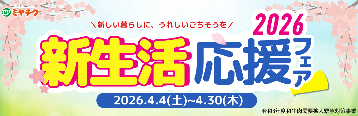 株式会社ミヤチク(本社:宮崎県都城市/代表取締役社長:船ヶ山 祐二)が運営する通販サイト「ミヤチクオンラインショップ」にて、期間限定で「新生活応援フェア2026」を開催中です。