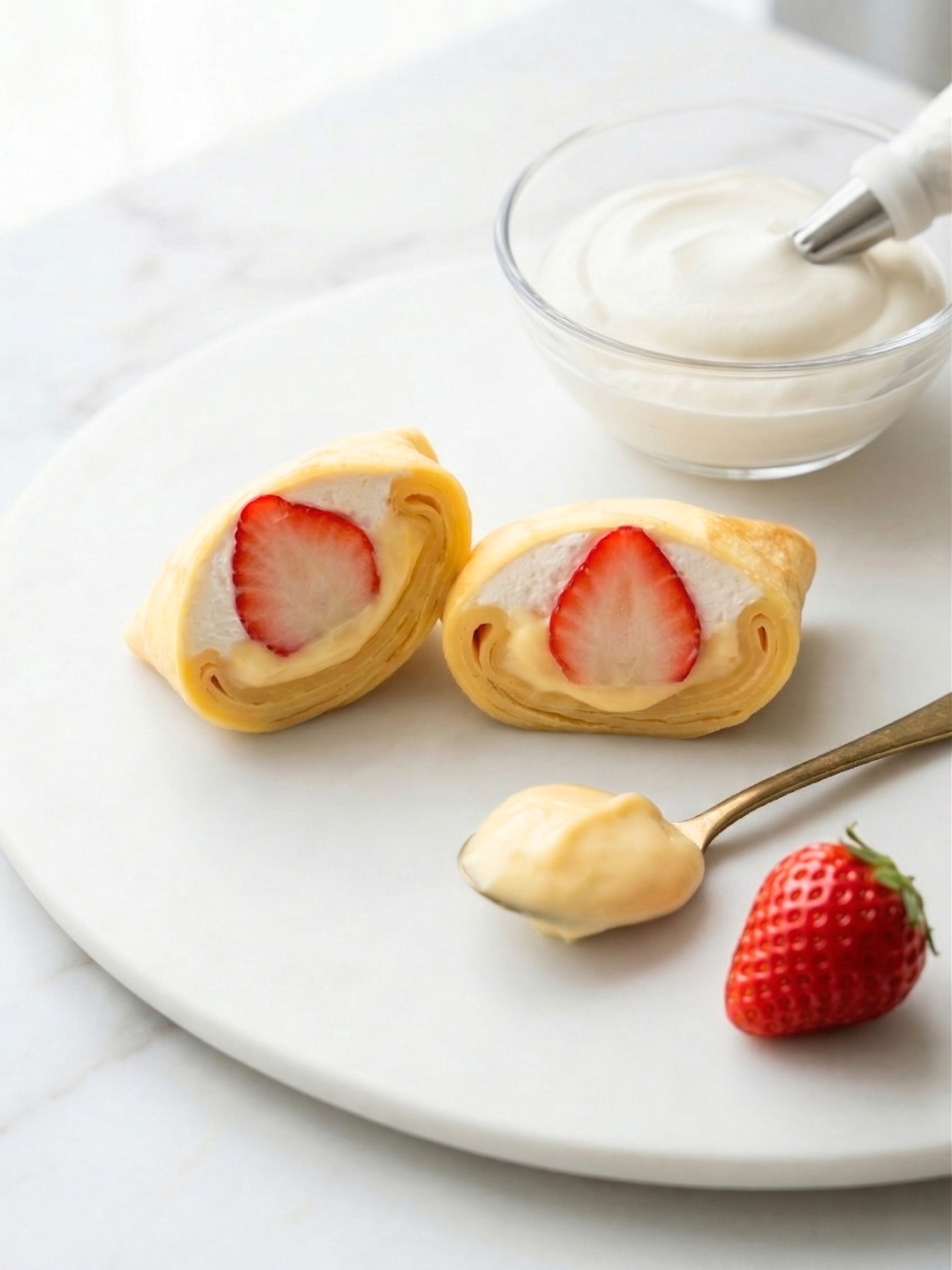 特製カスタードとホイップのダブルクリームで イチゴをつつんだ新作クレープです。