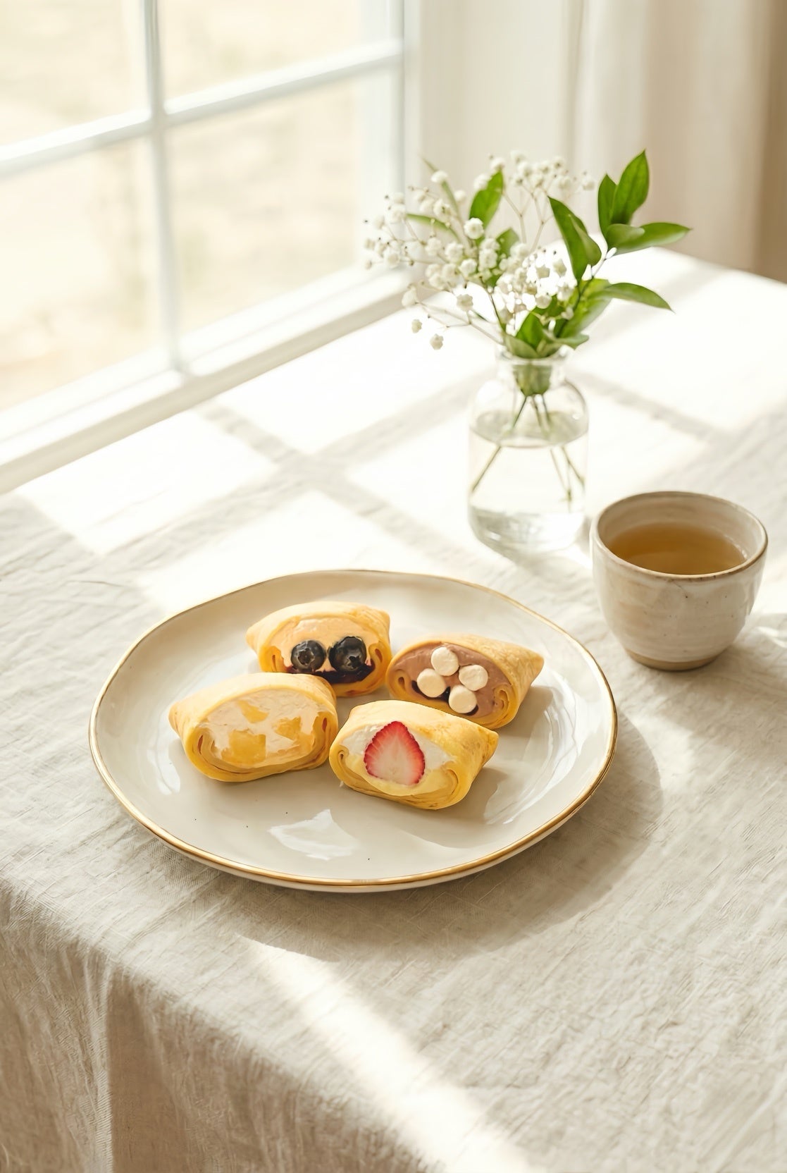 4月だけの特別な限定フレーバーを、4種類販売します。もちもち食感のクレープ生地に、たっぷりのクリームとそれぞれの具材をトッピングした、口いっぱいに広がる満足感のあるスイーツです。