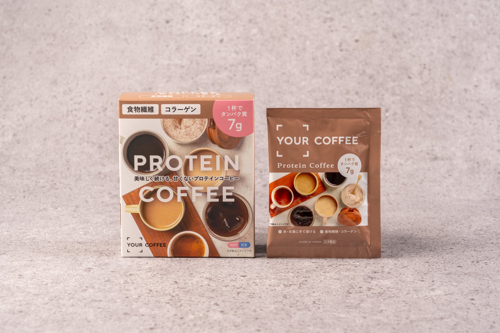 YOUR COFFEEは、1包(1杯)でタンパク質7gを摂取できるプロテインコーヒーです。普段のインスタントコーヒーと置き換えるだけで、手軽に卵約1個分のタンパク質を補給できます。