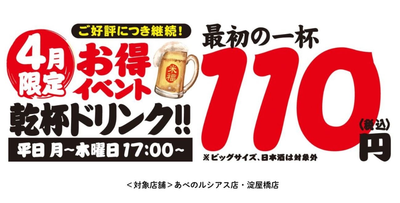 内容: 最初の1杯を110円(税込)でご提供いたします。