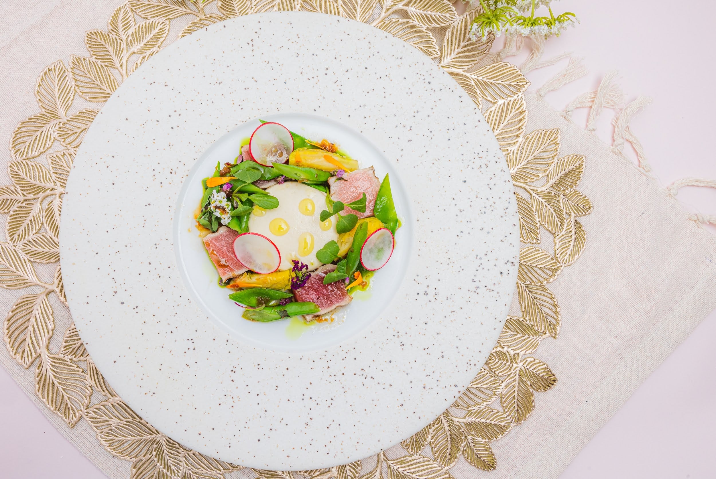 【Cold Appetizer】新玉ねぎのブランマンジェ 薪焼き本マグロと旬野菜を添えて