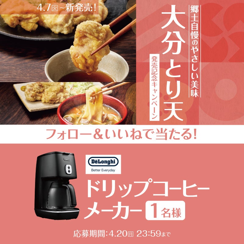 このたび日本国内の「やよい軒」では、やよい軒公式X・公式Instagramにおいて、『大分とり天定食』の発売を記念し、Xでは「やよい軒お食事券」、Instagramでは「デロンギ ドリップコーヒーメーカー」が当たる!キャンペーンを実施いたします。