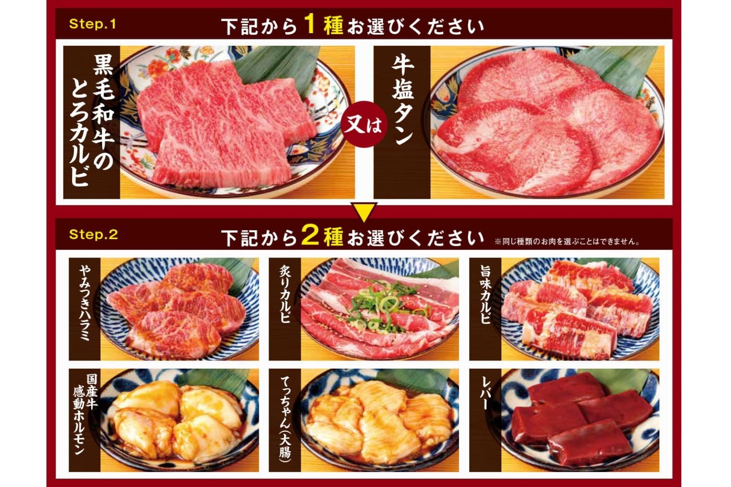 Step.2(下記から2種):旨味カルビ/レバー/炙りカルビ/てっちゃん(大腸)/国産牛感動ホルモン/ やみつきハラミ(※同種の選択不可)