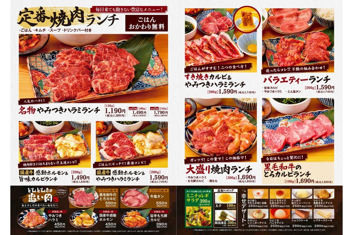 メニューは、大人気の「やみつきハラミ」をはじめとした「六大名物」など、焼肉どんどん亭ならではのこだわり抜いた逸品を提供しています。食べ放題コースは「ベーシックコース」「デラックスコース」「プレミアムコース」の3種類を展開しており、プレミアムコースでは牛タンや黒毛和牛なども対象となります。