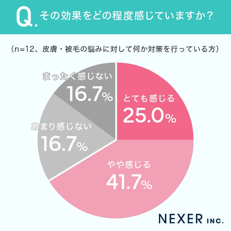 その結果「とても感じる」が25.0%、「やや感じる」が41.7%で、合わせて66.7%の方が何らかの効果を実感しているという結果でした。