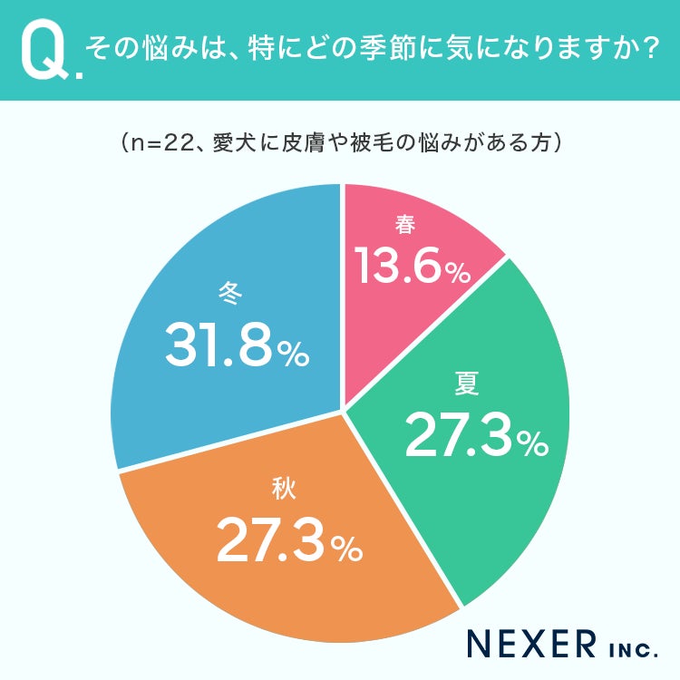 その結果「冬」が31.8%で最も多く、「夏」と「秋」がともに27.3%、「春」が13.6%という結果でした。乾燥しやすい冬場に悩みを感じる飼い主が多いようですが、季節を問わずトラブルが起きていることもわかります。