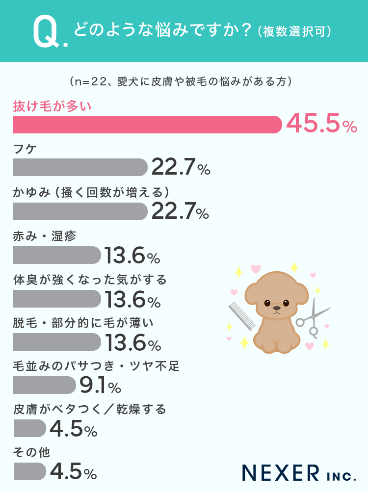 最も多かったのは「抜け毛が多い」で45.5%でした。次いで「フケ」と「かゆみ(掻く回数が増える)」がともに22.7%で並びました。そのほか「赤み・湿疹」「体臭が強くなった気がする」「脱毛・部分的に毛が薄い」がそれぞれ13.6%と続いています。